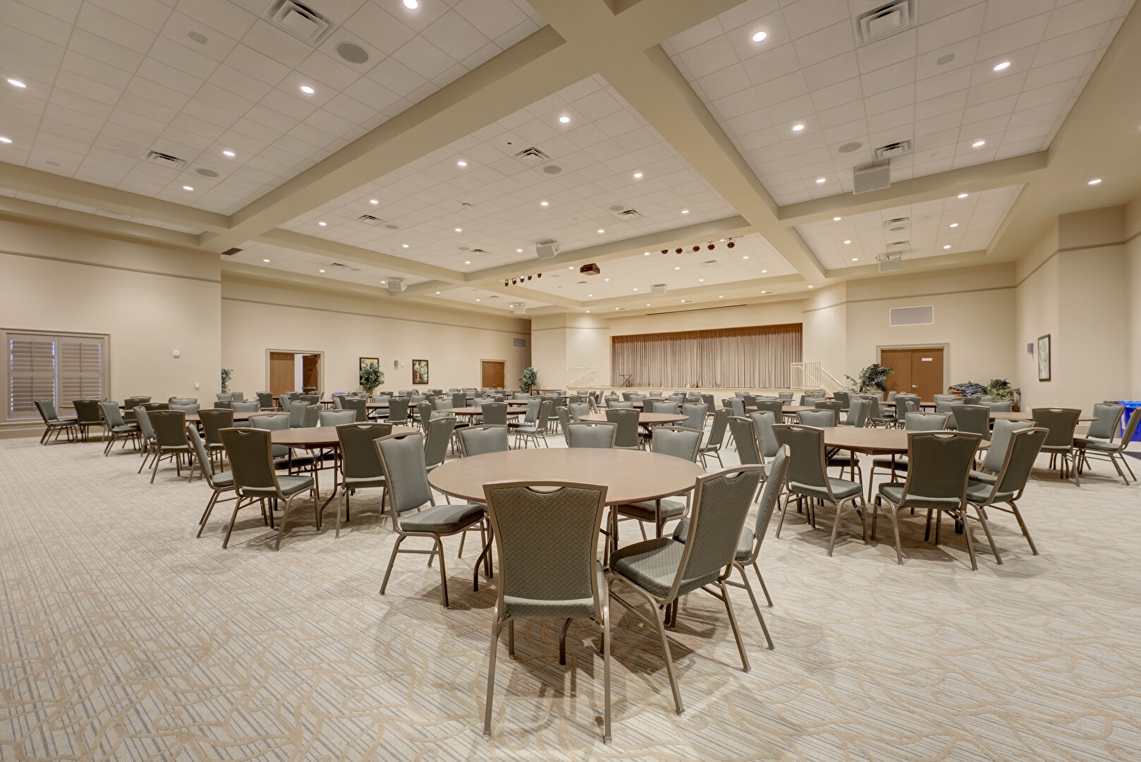 Beamed Ceiling, Carpet, Coffered Ceiling, High Ceiling, Recessed Lighting, Tray Ceiling, Vent, Drywall