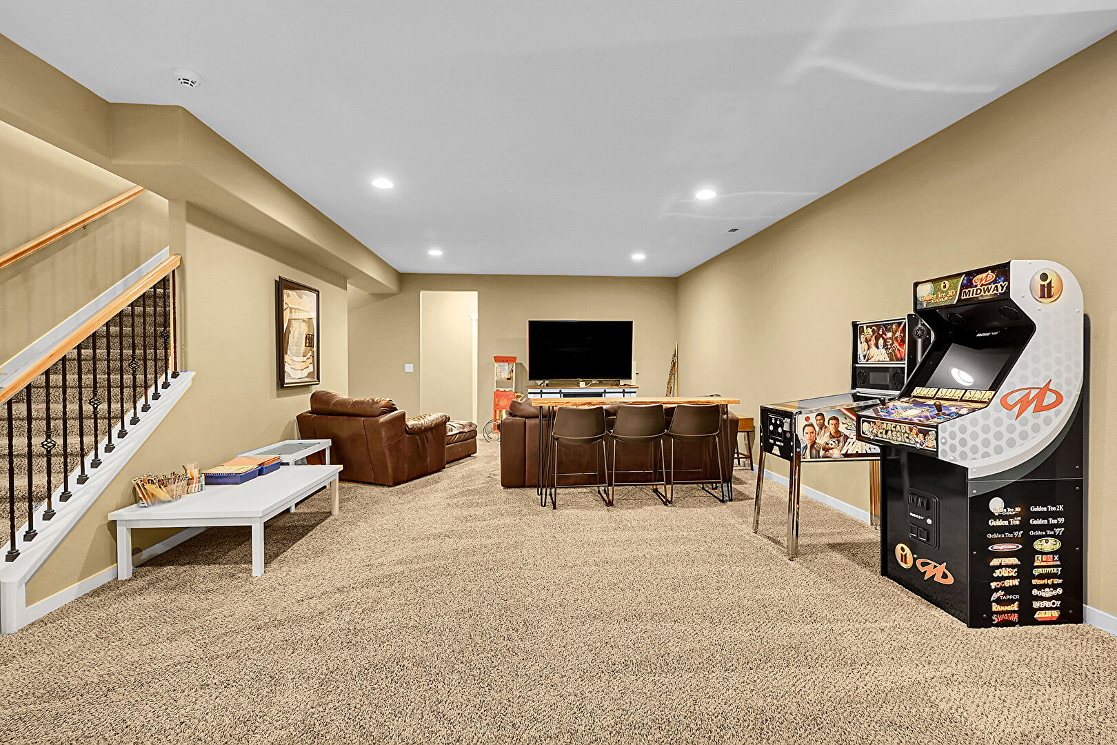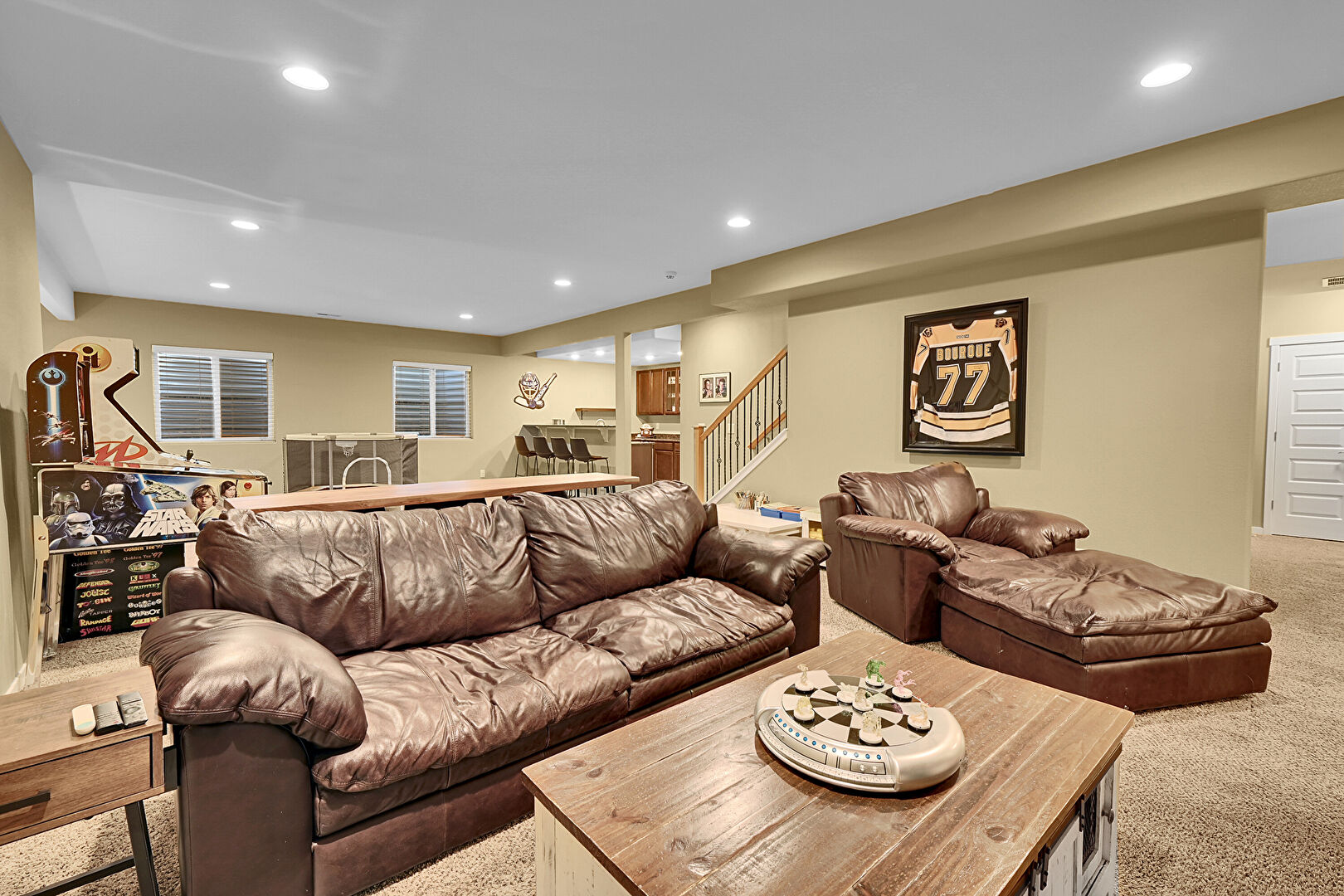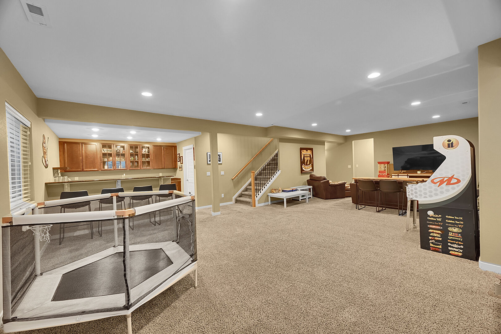 Baseboards Wall, Basement, Billiards, Carpet, Drywall, Indoor Bar, Natural Light, Recessed Lighting, Stairs, Baseboards Wall, Basement, Recessed Lighting