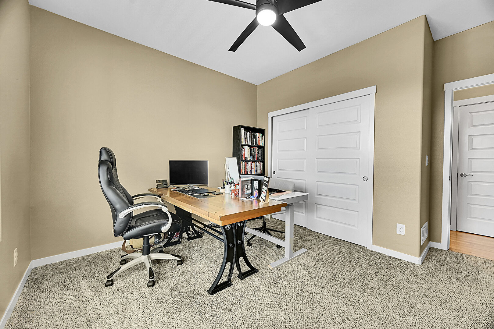 Baseboards Wall, Carpet, Ceiling Fan, Drywall, Hardwood Floor, Natural Light, Office Area, Vent, Baseboards Wall, Drywall