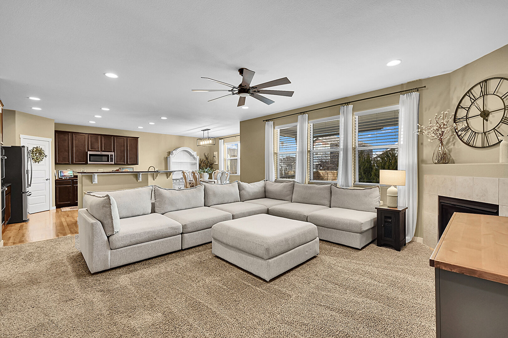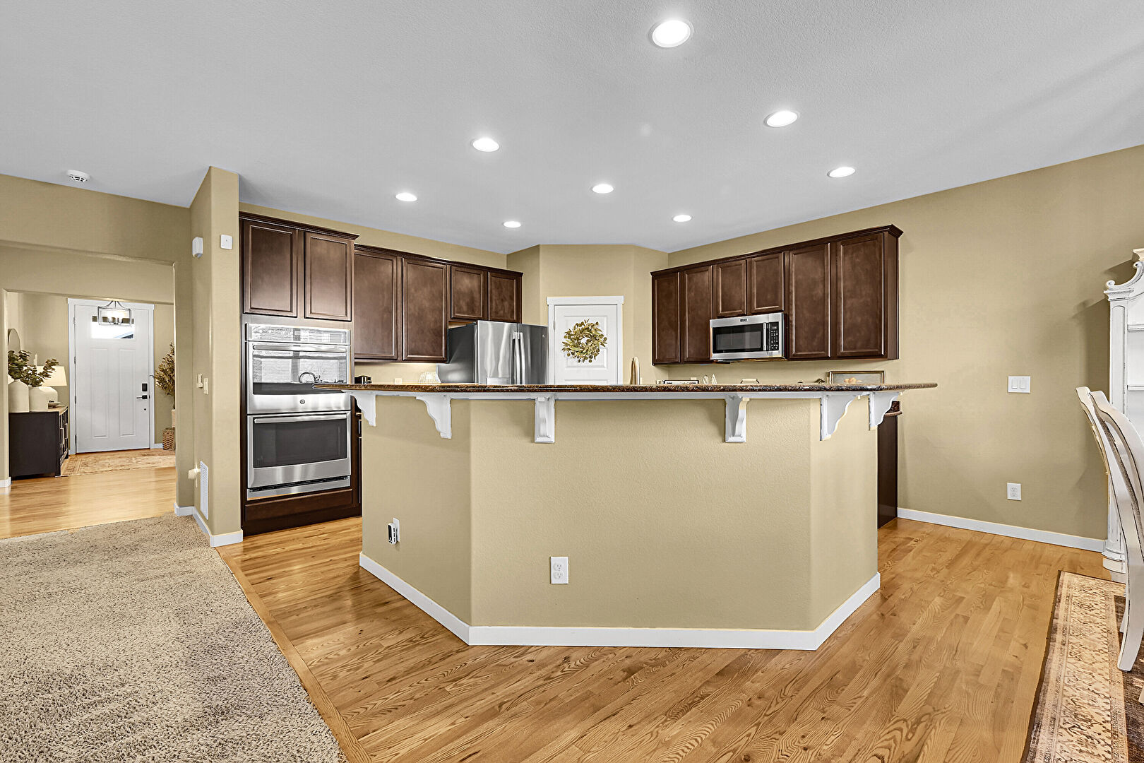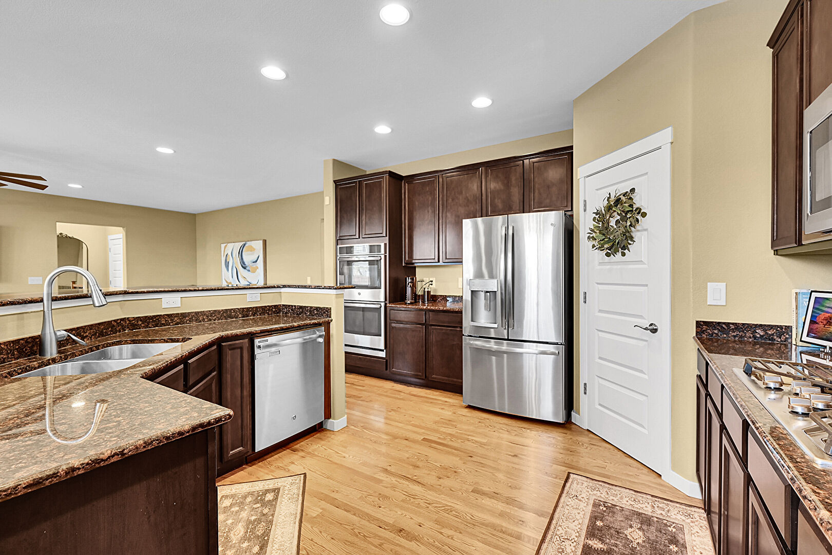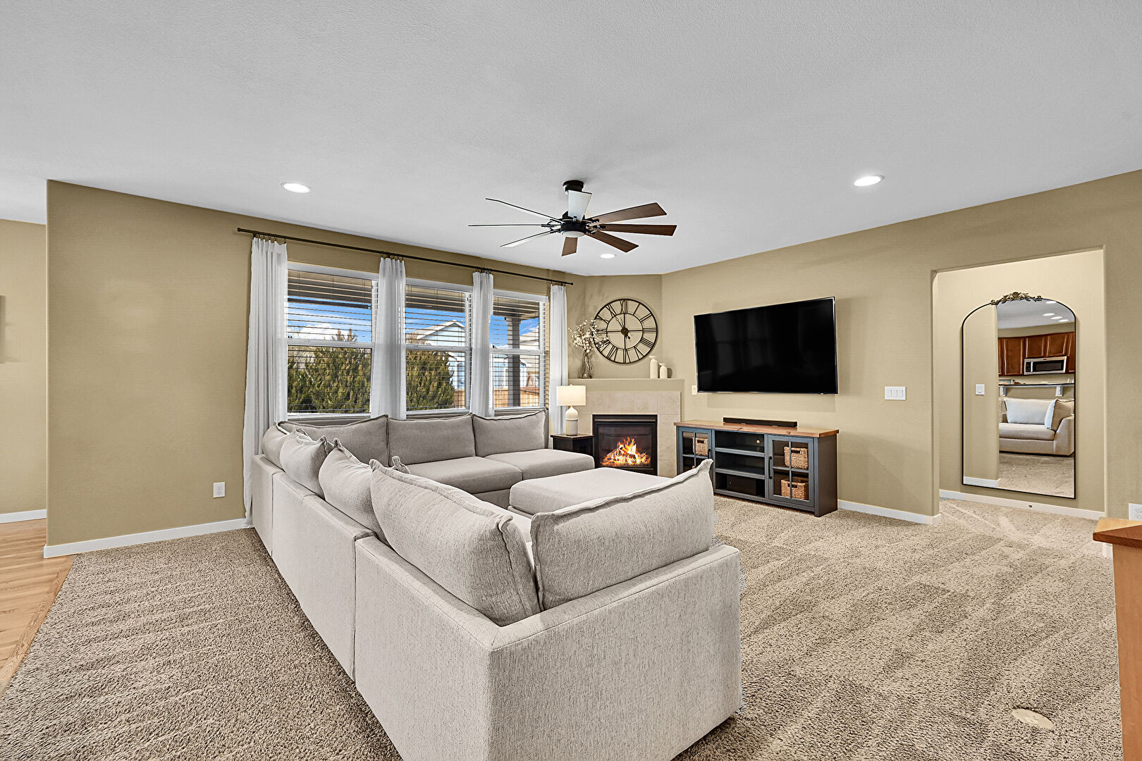 Arched Walkways, Baseboards Wall, Carpet, Ceiling Fan, Double Oven, Drywall, Fireplace, Hardwood Floor, L Shaped Kitchen, Natural Light, Recessed Lighting, Baseboards Wall, Carpet, Ceiling Fan, L Shaped Kitchen, Natural Light, Notable Chandelier, Recessed Lighting, Wood Finish Floor