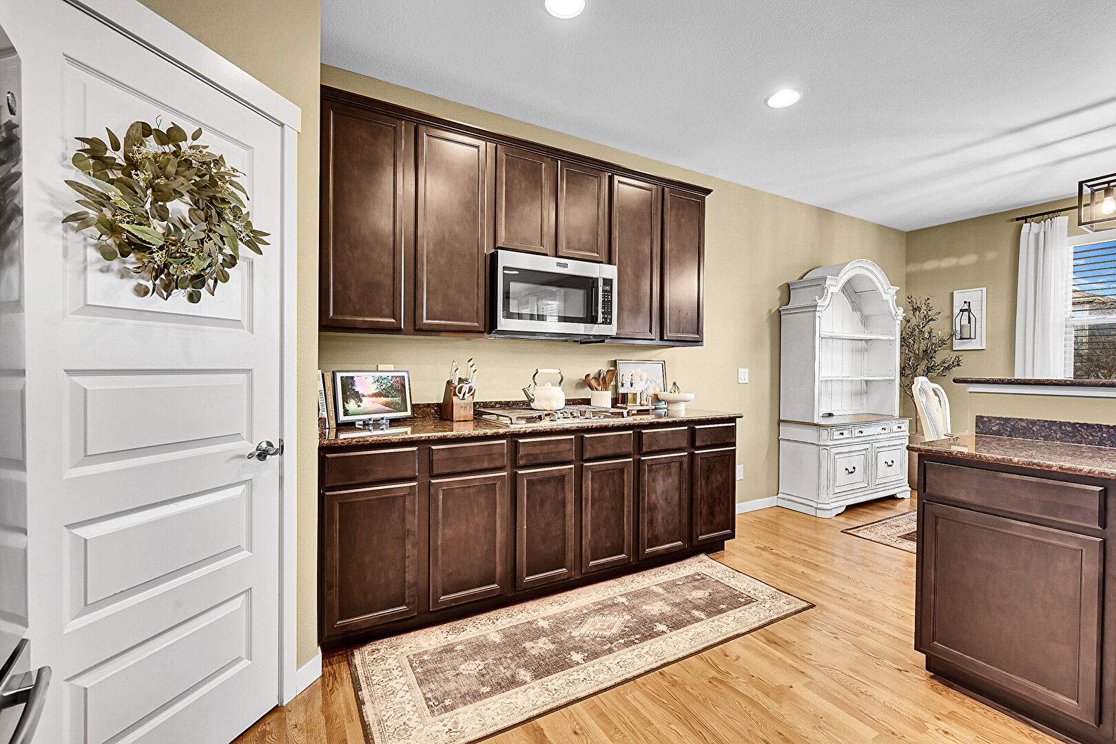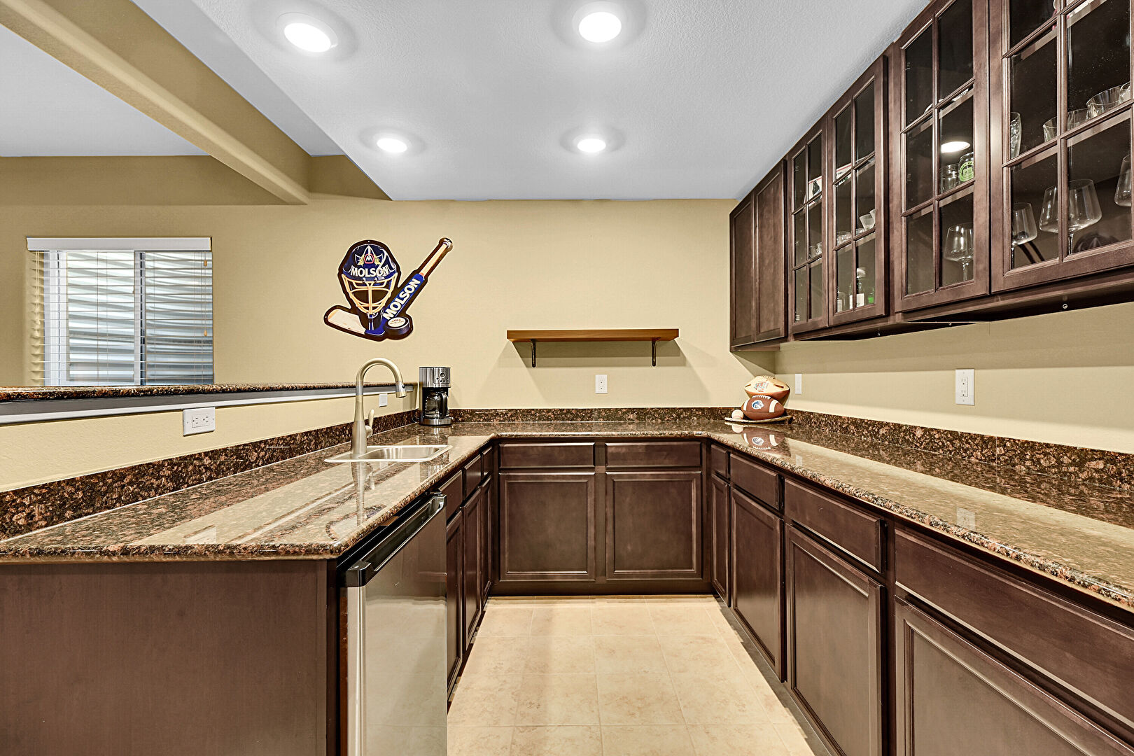 Baseboards Wall, Beamed Ceiling, Carpet, Drywall, Glass Insert Cabinets, Kitchen Bar, Kitchen Peninsula, Natural Light, Open Shelves, Recessed Lighting, Shaker Cabinets, Stone Countertops, Tile Floor, Medium Brown Cabinets