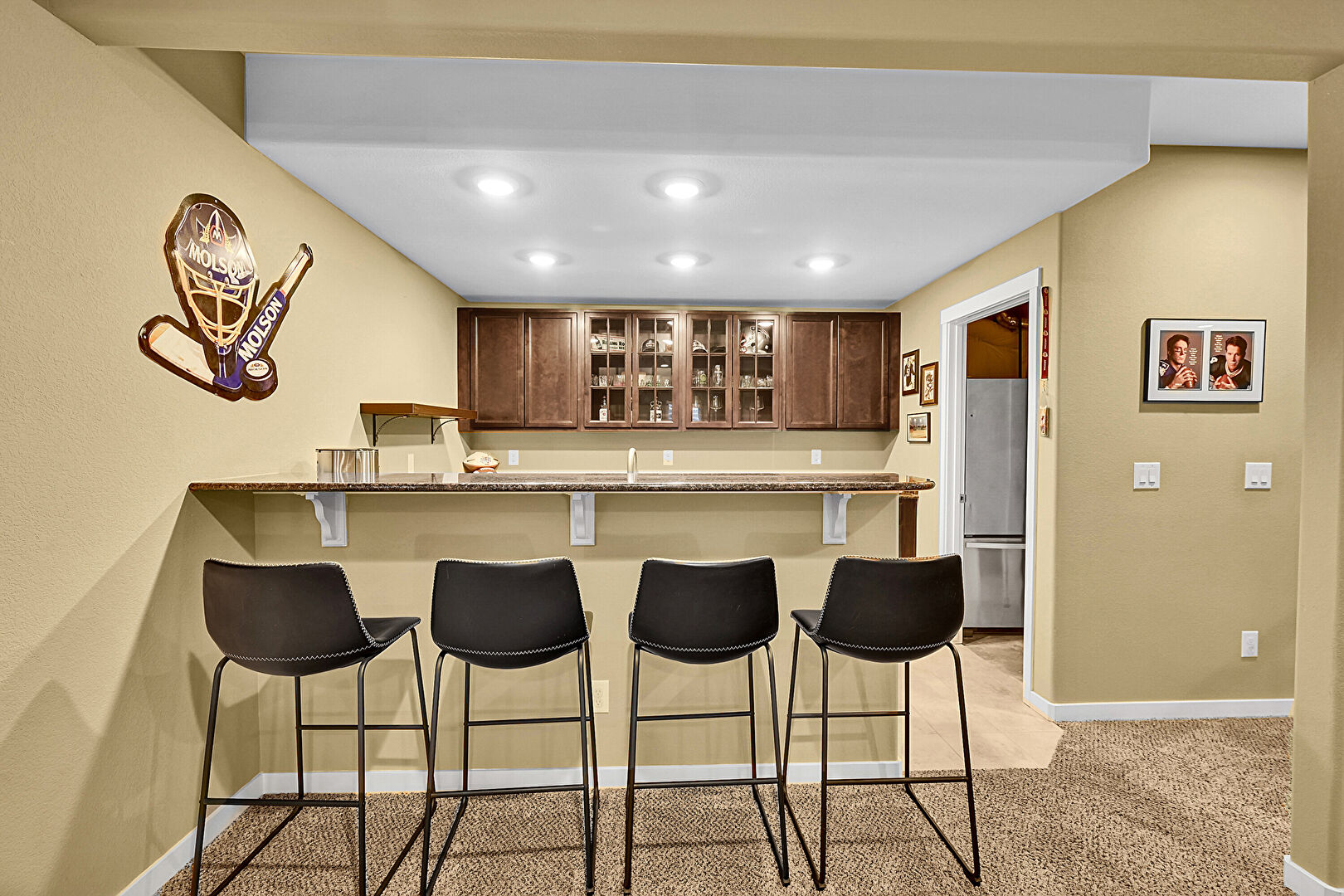 Baseboards Wall, Basement, Carpet, Drywall, Glass Insert Cabinets, Medium Brown Cabinets, Recessed Lighting, Shaker Cabinets, Stairs, Vent, Carpet, Indoor Bar
