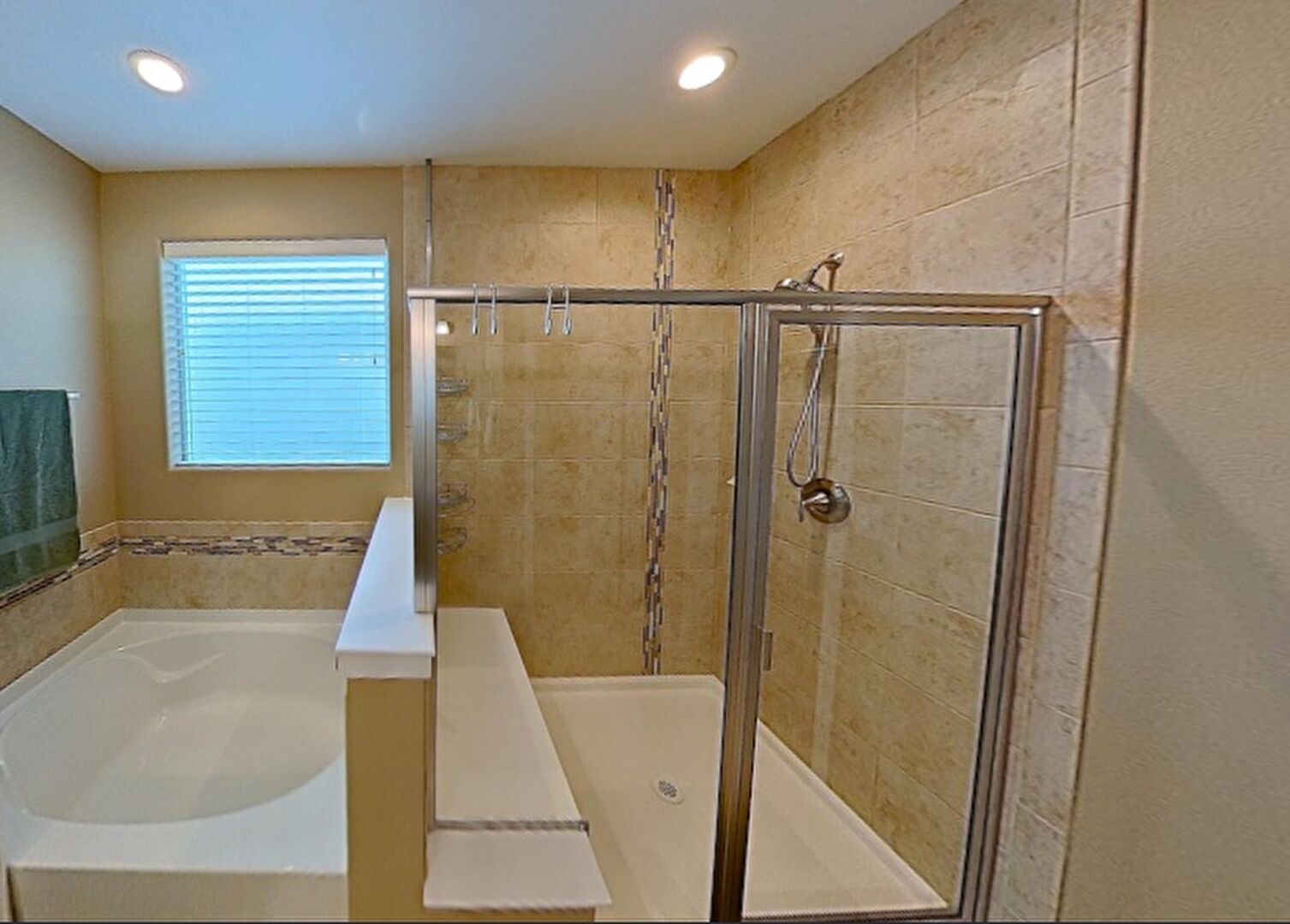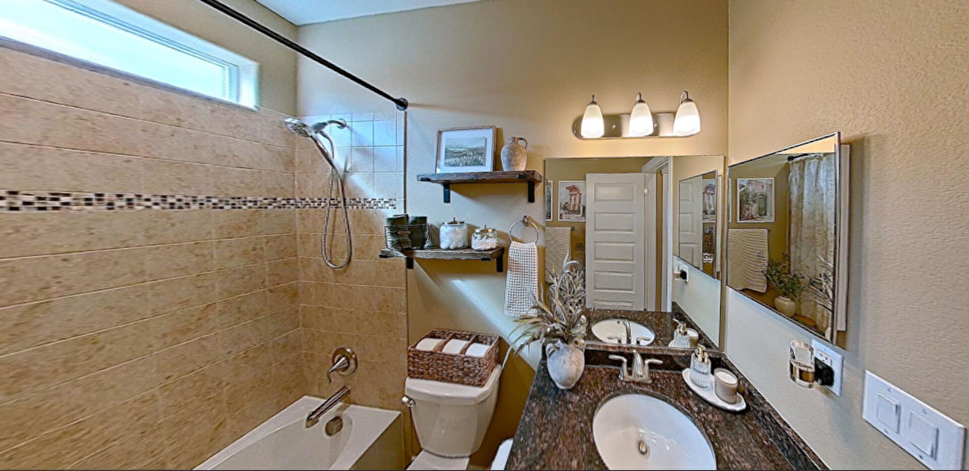 Baseboards Wall, Combined Bath Shower, Drywall, Ensuite Bathroom, Full Bathroom, Recessed Lighting, Tile Floor, Vanity, Vent, Drywall, Natural Light, Recessed Lighting