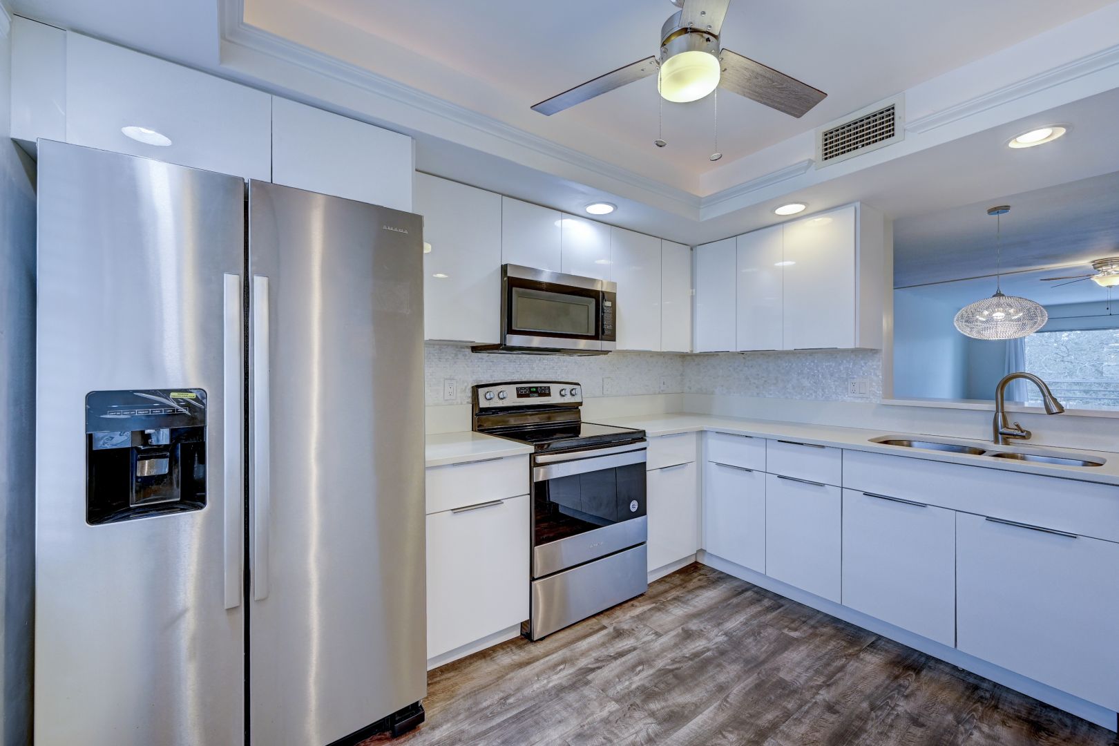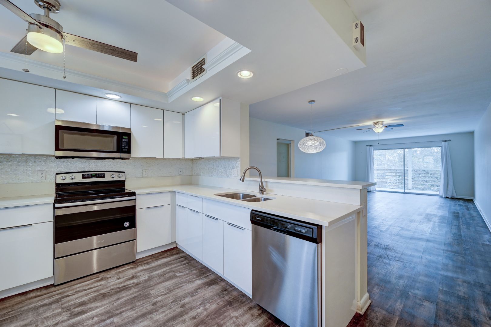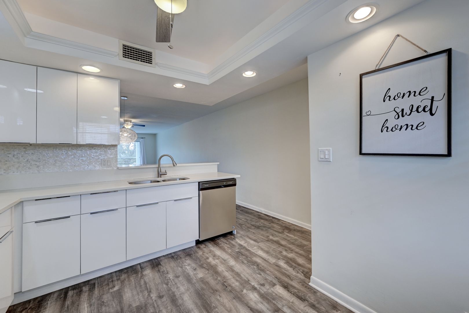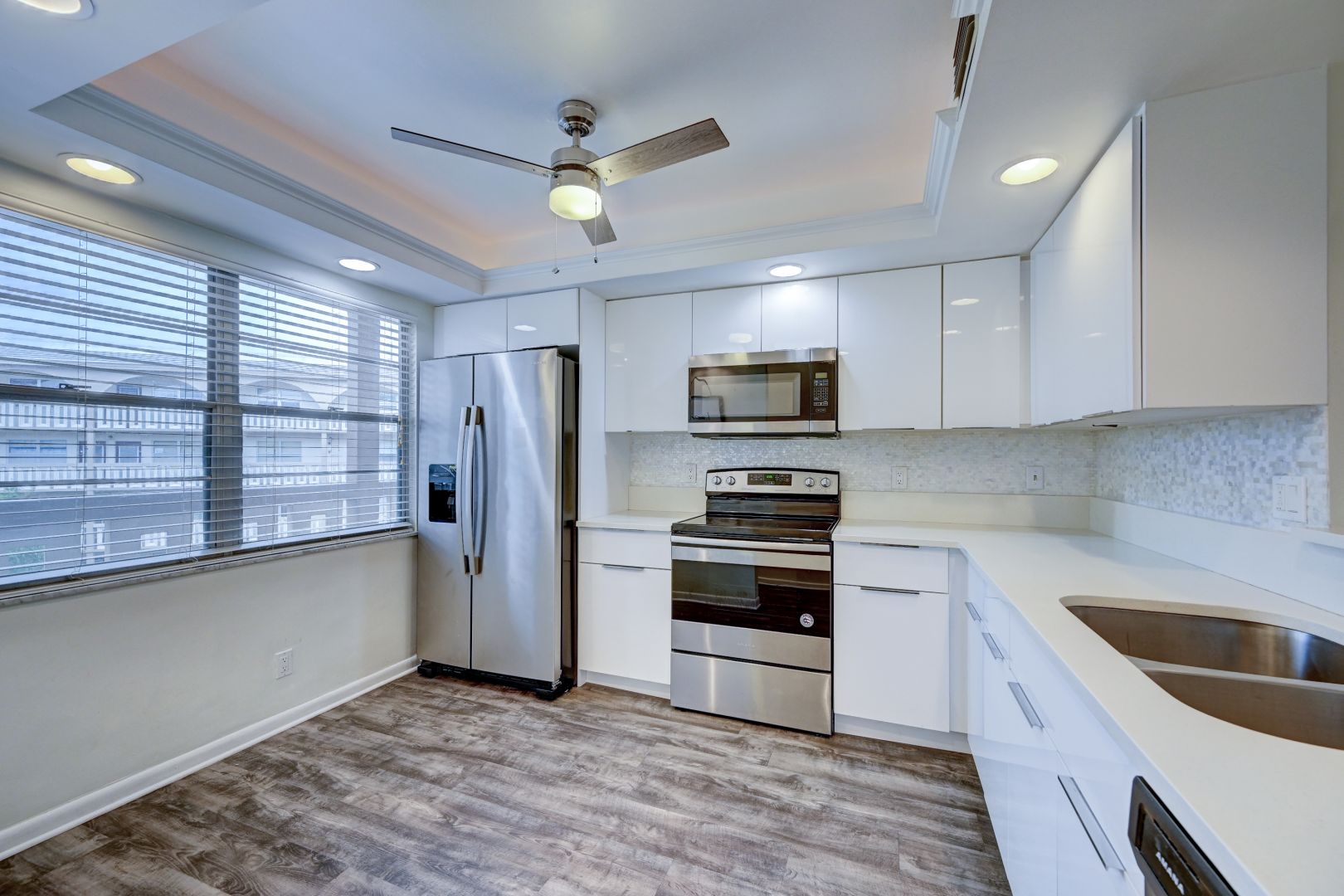 Baseboards Wall, Ceiling Fan, Crown Molding, Drywall, Flat Panel Cabinets, Hardwood Floor, Kitchen Peninsula, Natural Light, Opens To Living Area, Pendant Lighting, Recessed Lighting, Stone Countertops, Tray Ceiling, Vent, Vinyl Floor, Wood Finish Floor, Baseboards Wall, Recessed Lighting, Stone Countertops, Wood Finish Floor