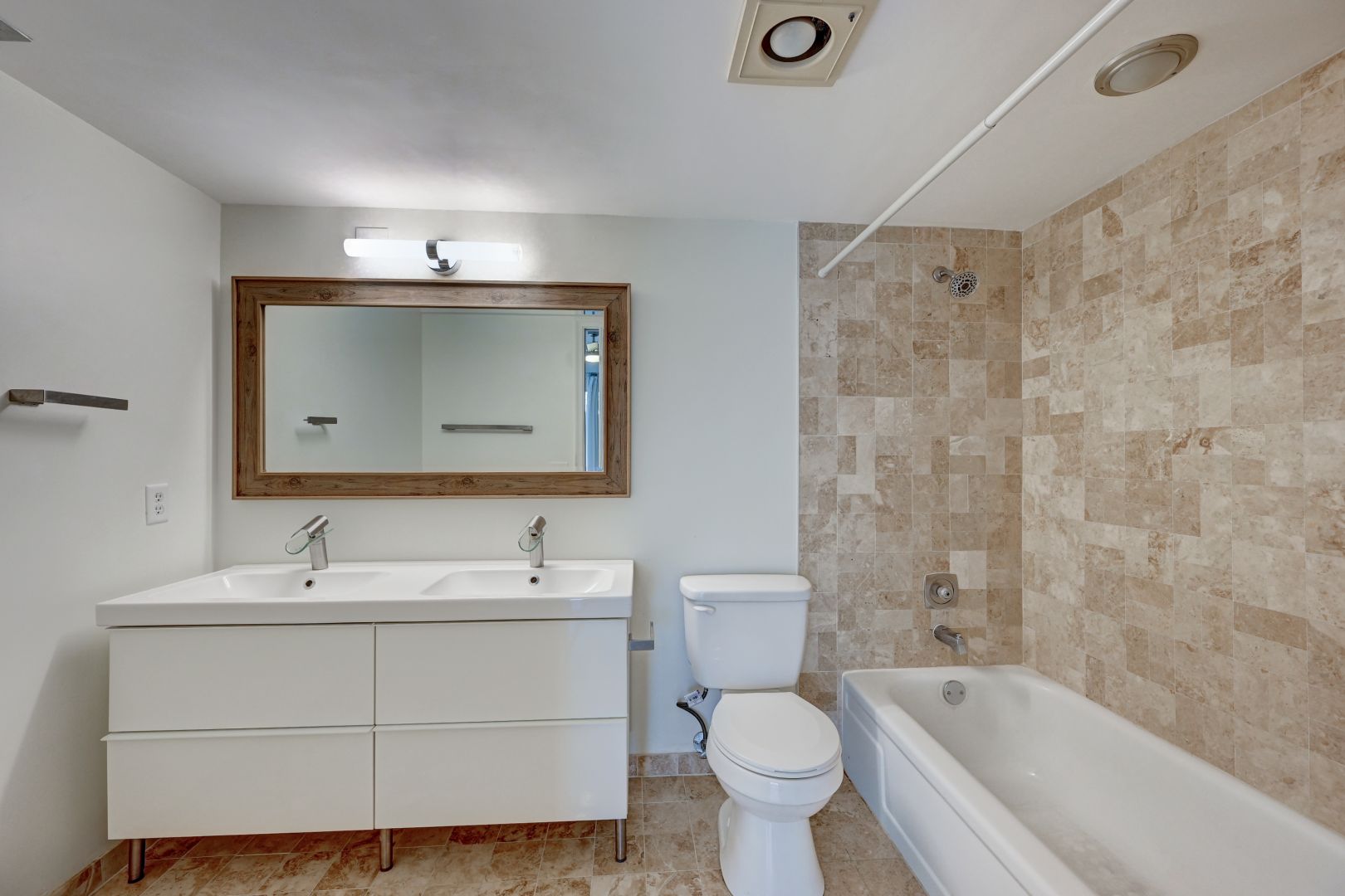 Baseboards Wall, Combined Bath Shower, Double Sink, Drywall, Full Bathroom, Tile Floor, Vanity, Double Vanity