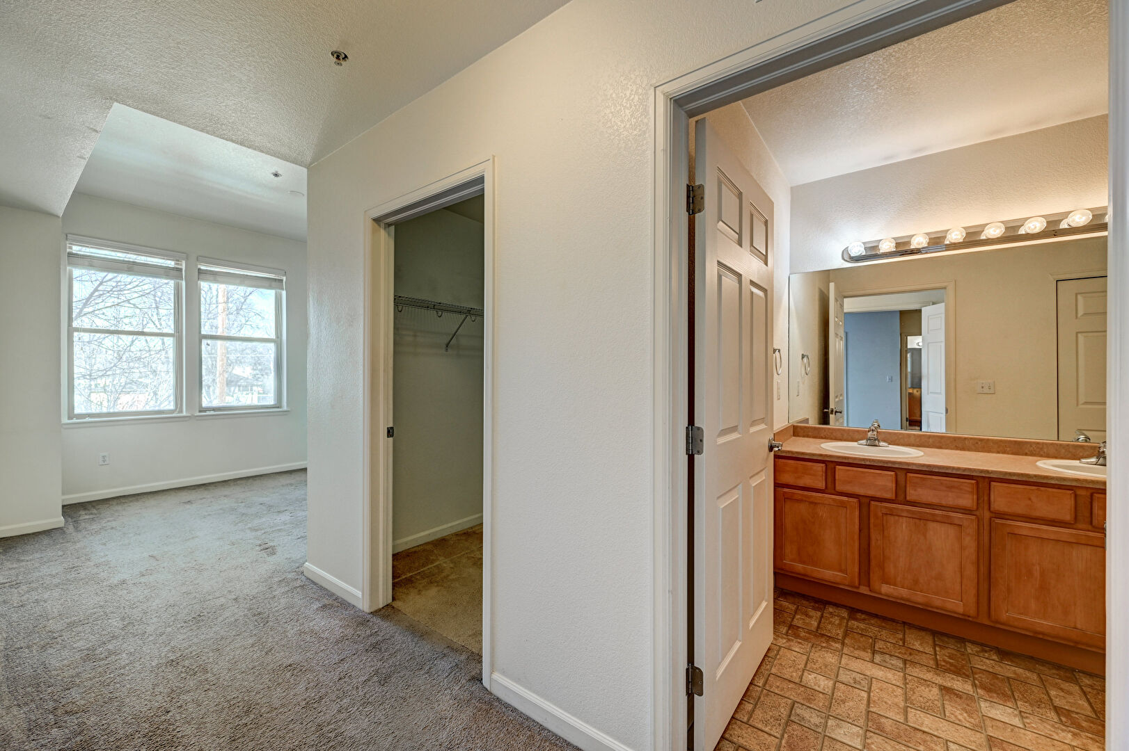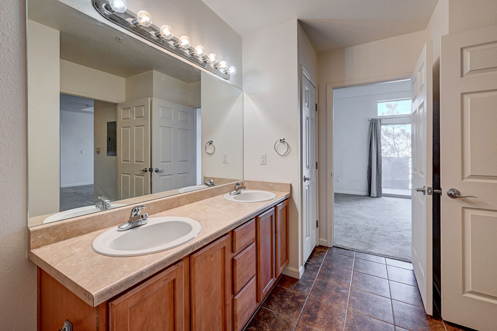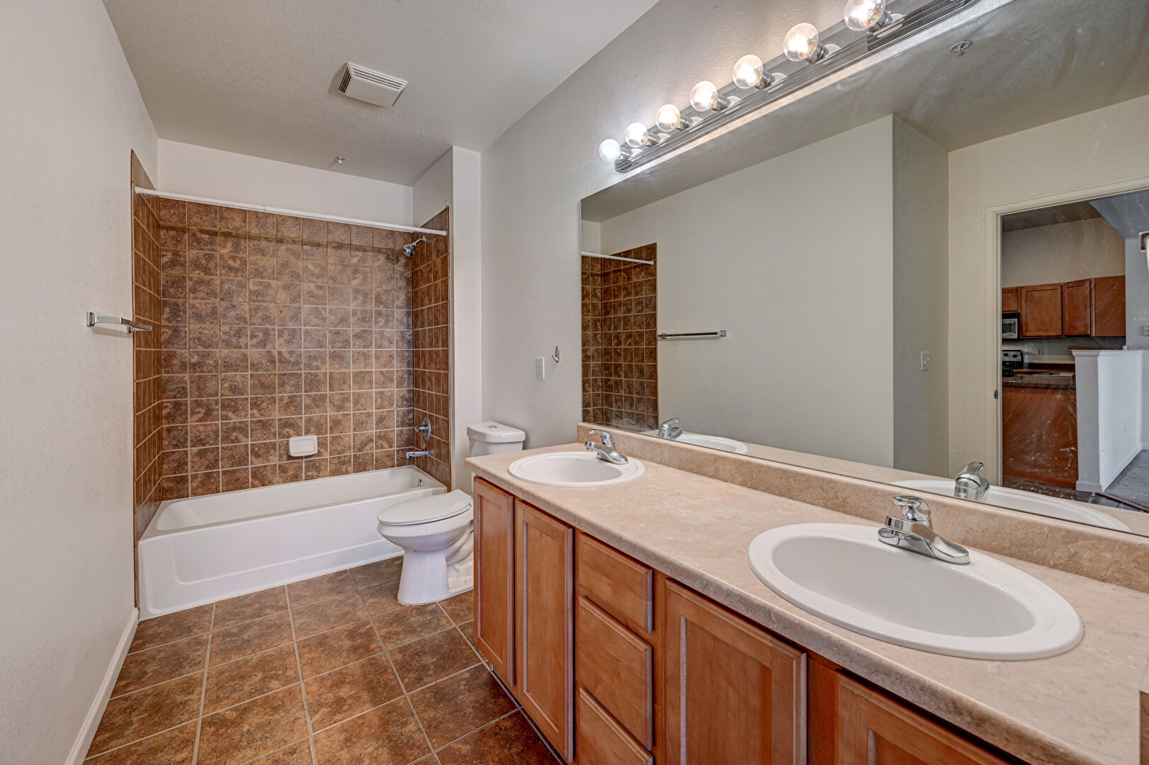 Combined Bath Shower, Double Sink, Natural Light, Tile Floor, Vanity, Natural Light, Textured Ceiling, Vanity