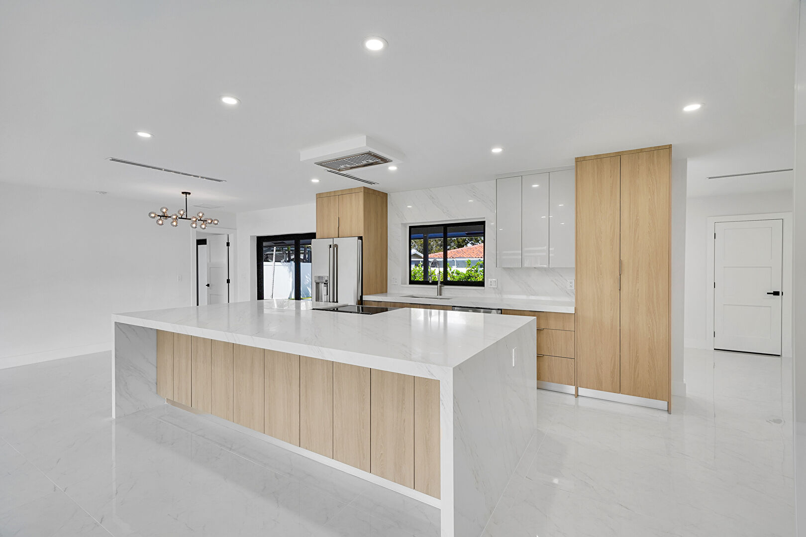 Baseboards Wall, Drywall, Flat Panel Cabinets, Kitchen Island, Marble Finish Floor, Natural Light, Notable Chandelier, Recessed Lighting, Vent, Baseboards Wall, One Wall Kitchen, Recessed Lighting