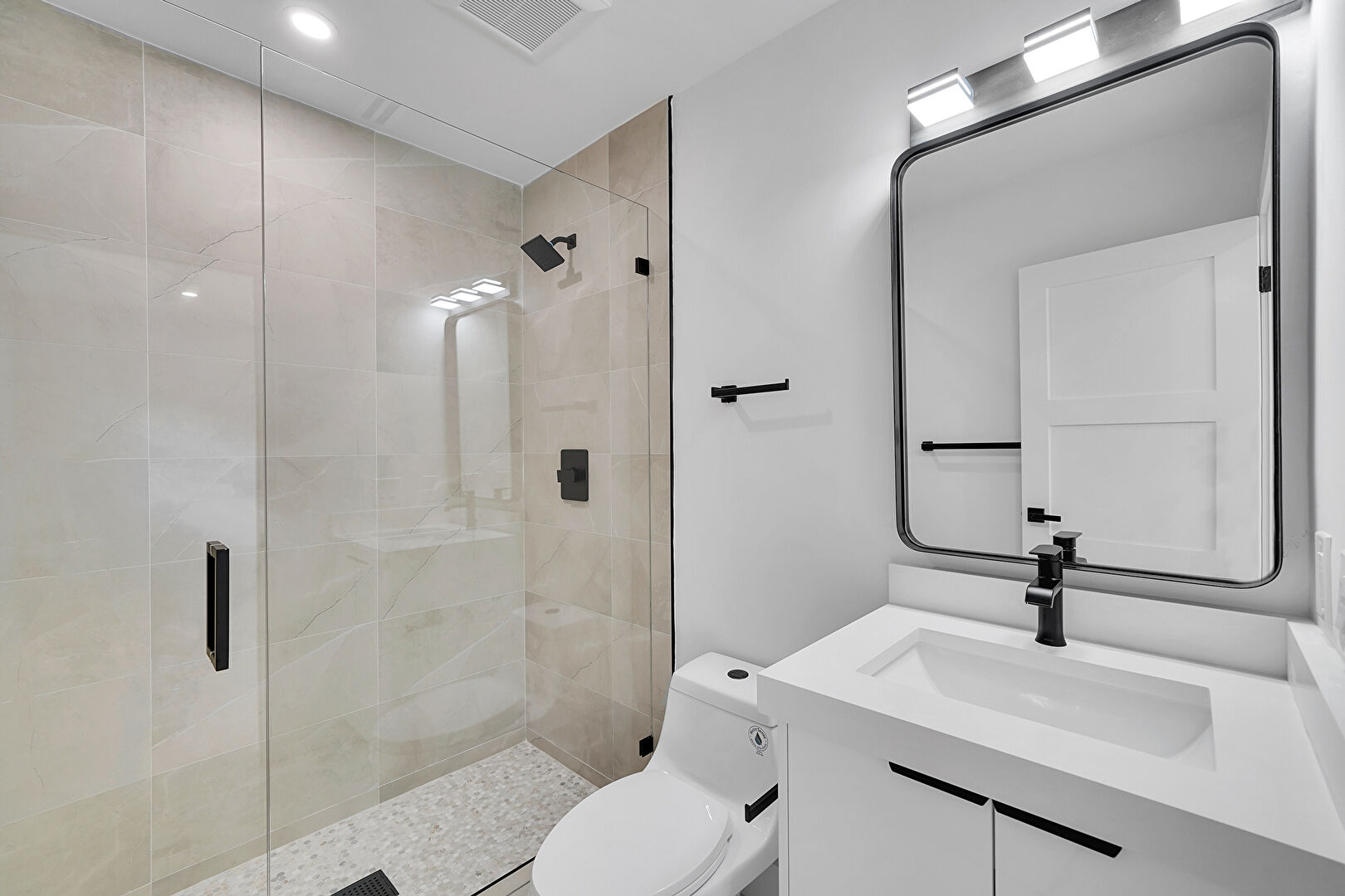 Baseboards Wall, Drywall, Marble Finish Floor, Natural Light, Recessed Lighting, Vent, Natural Light, Recessed Lighting