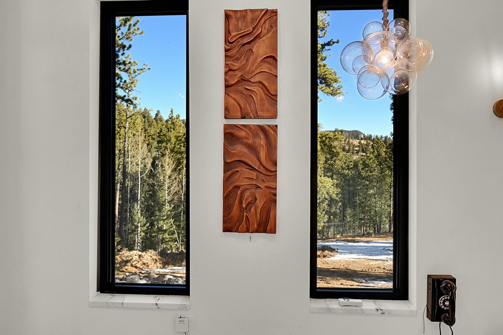 Baseboards Wall, Brick Wall, Concrete Floor, Drywall, Fire Alarm, Marble Finish Floor, Natural Light, Notable Chandelier, Pendant Lighting, Recessed Lighting, Stone Wall, Wood Stove, Baseboards Wall, Drywall, Forest View, Natural Light, Notable Chandelier, Stone Countertops, Washer Dryer