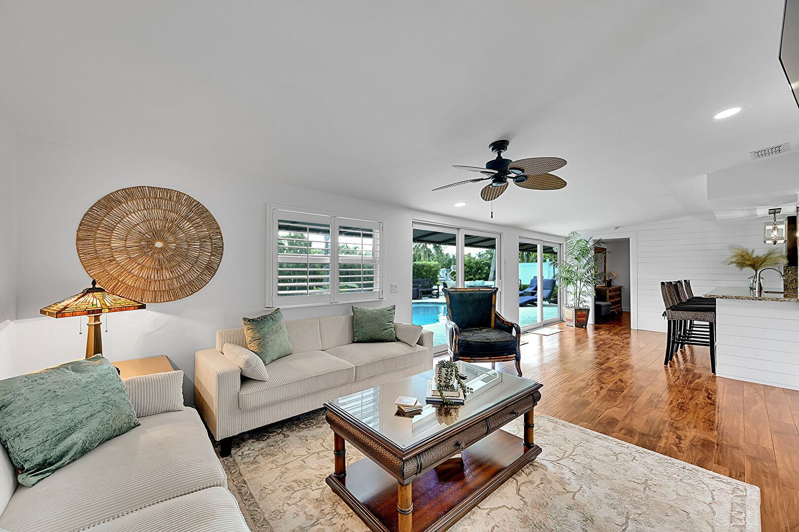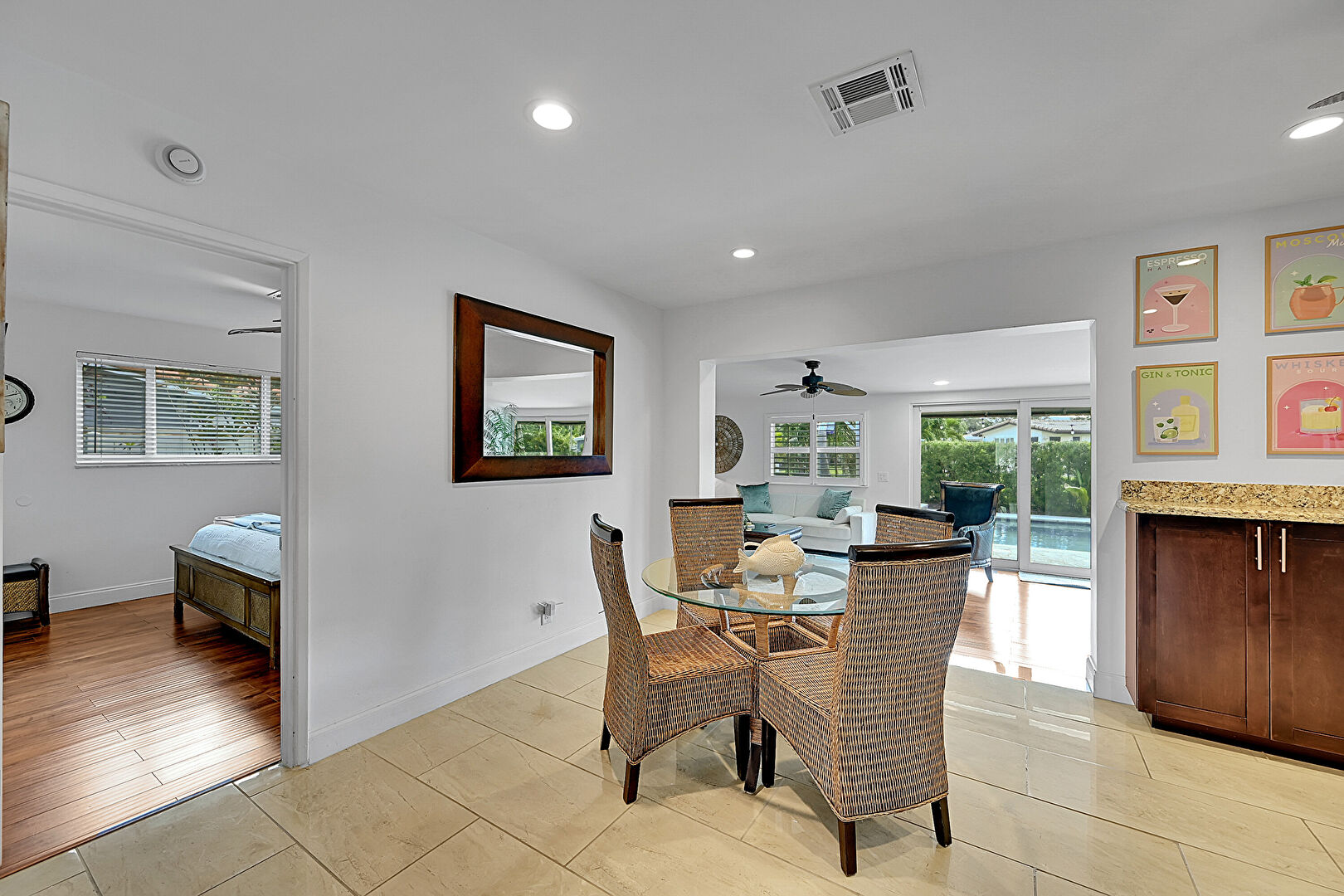 Baseboards Wall, Ceiling Fan, Drywall, Natural Light, Pendant Lighting, Recessed Lighting, Stone Countertops, Sunroom, Vent, Wood Finish Floor, Indoor Bar, Natural Light, Wood Finish Floor