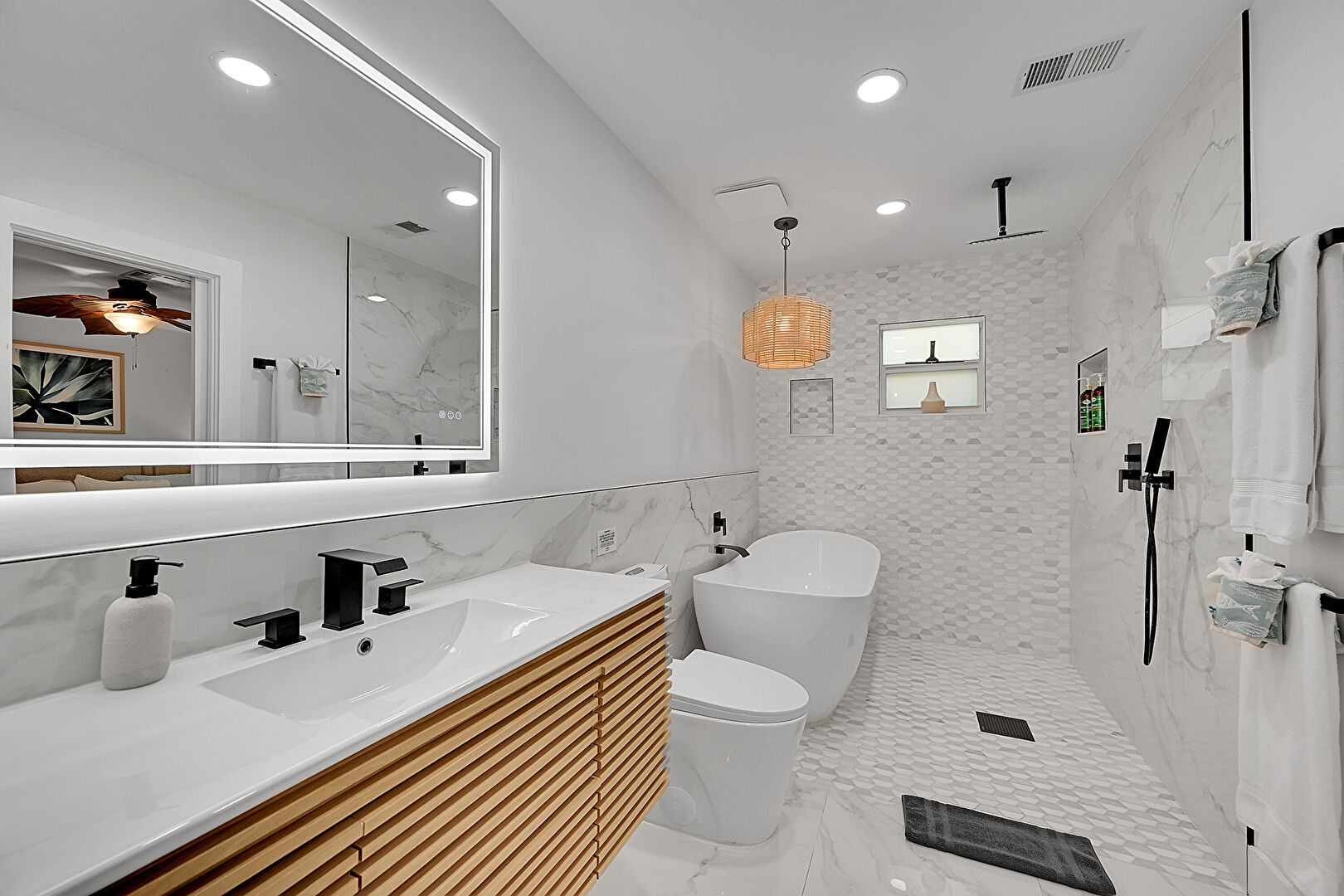 Ceiling Fan, Drywall, Full Bathroom, Marble Finish Floor, Natural Light, Recessed Lighting, Tile Wall, Vanity, Vent, Wainscot Wall, Baseboards Wall, Drywall