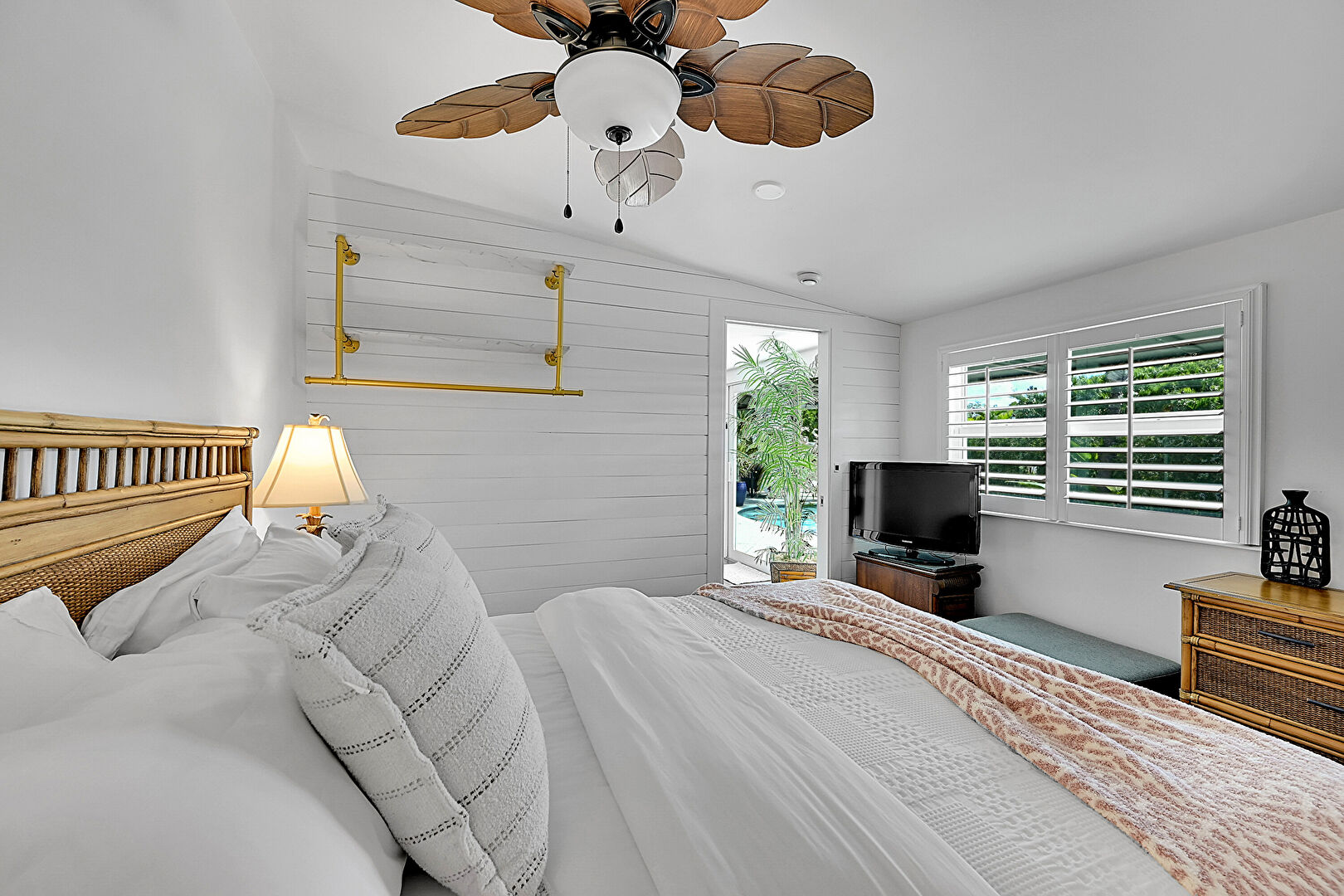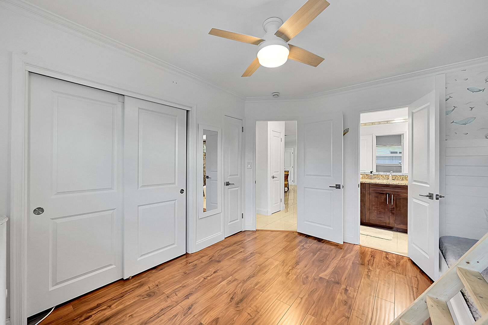Access To Exterior, Baseboards Wall, Ceiling Fan, Closet, Crown Molding, Drywall, Ensuite Bathroom, Natural Light, Smoke Carbon Monoxide Detector, Vent, Wallpaper Wall, Wood Finish Floor, Wood Wall, Baseboards Wall, Ceiling Fan, Closet, Crown Molding, Natural Light, Vaulted Ceiling, Wood Finish Floor