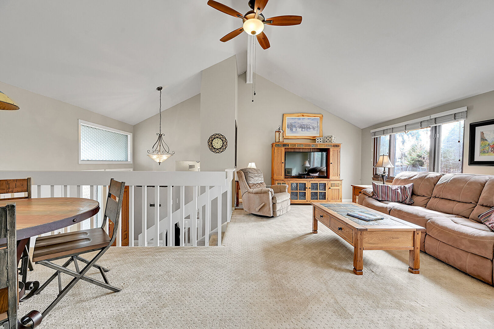 Baseboards Wall, Beamed Ceiling, Carpet, Cathedral Ceiling, Ceiling Fan, Drywall, High Ceiling, Natural Light, Vaulted Ceiling, Vent, Beamed Ceiling, Carpet, Cathedral Ceiling, Drywall, Vaulted Ceiling