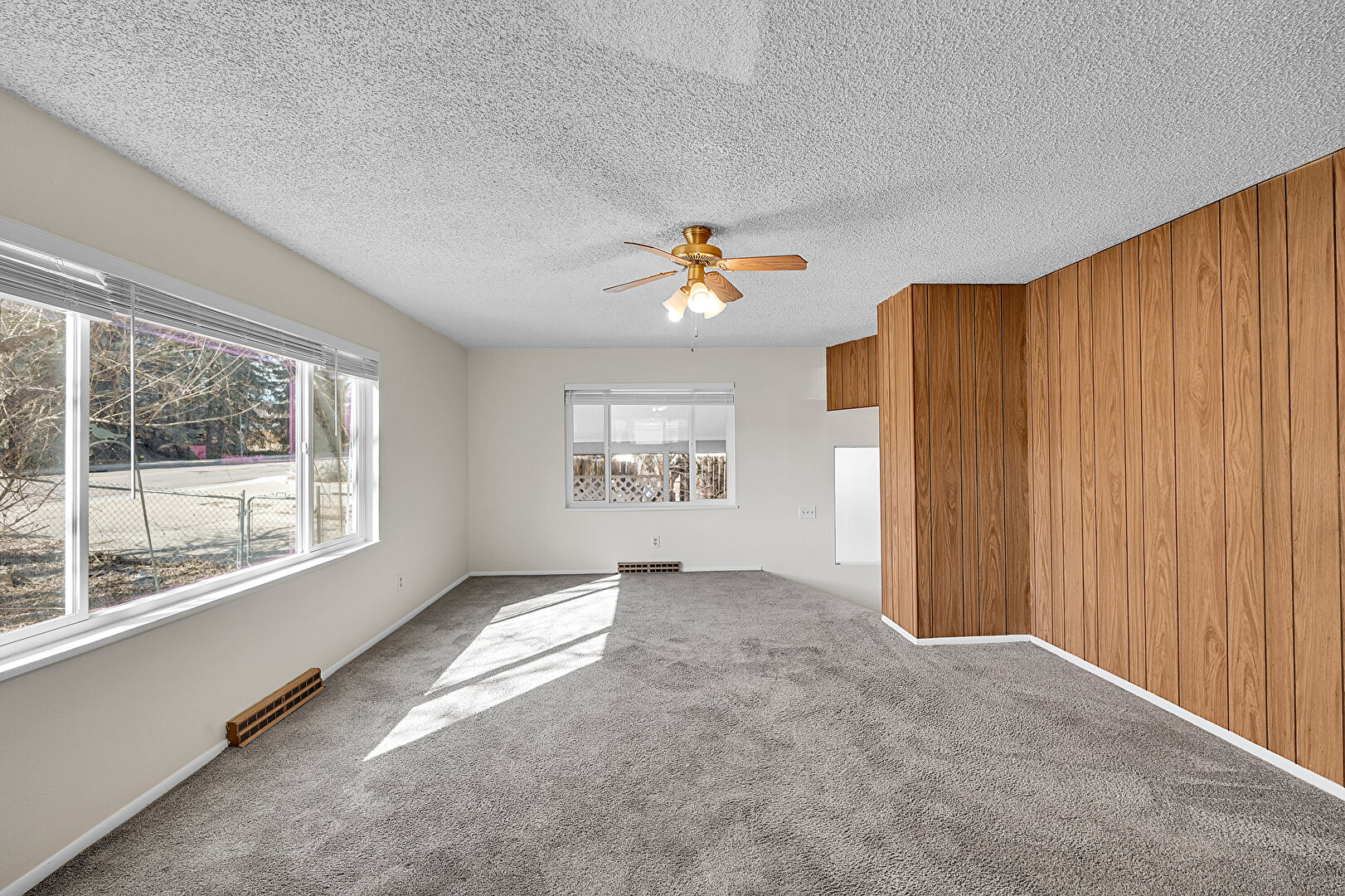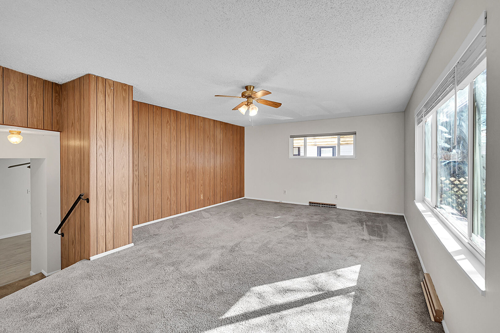 Baseboard Radiator, Baseboards Wall, Carpet, Ceiling Fan, Drywall, Natural Light, Textured Ceiling, Vent, Wood Wall, Ceiling Fan, Textured Ceiling