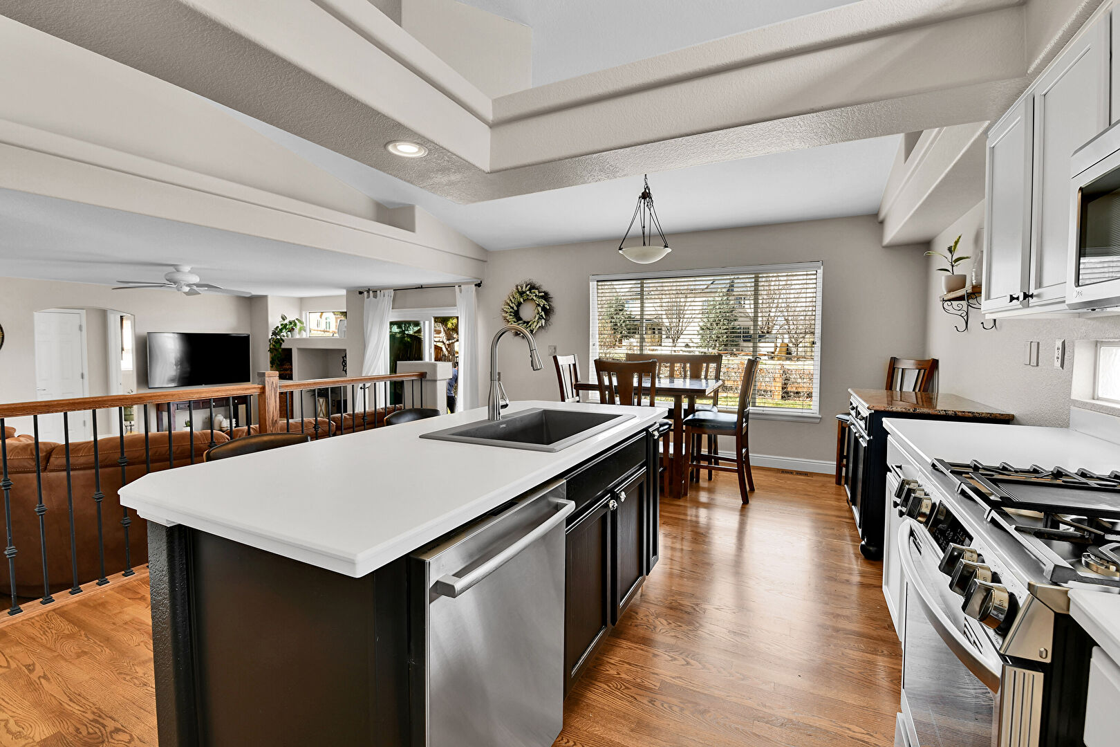 Baseboards Wall, Drywall, Natural Light, Recessed Lighting, Stairs, Vaulted Ceiling, Vent, Wood Finish Floor, Baseboards Wall, L Shaped Kitchen, Wood Finish Floor