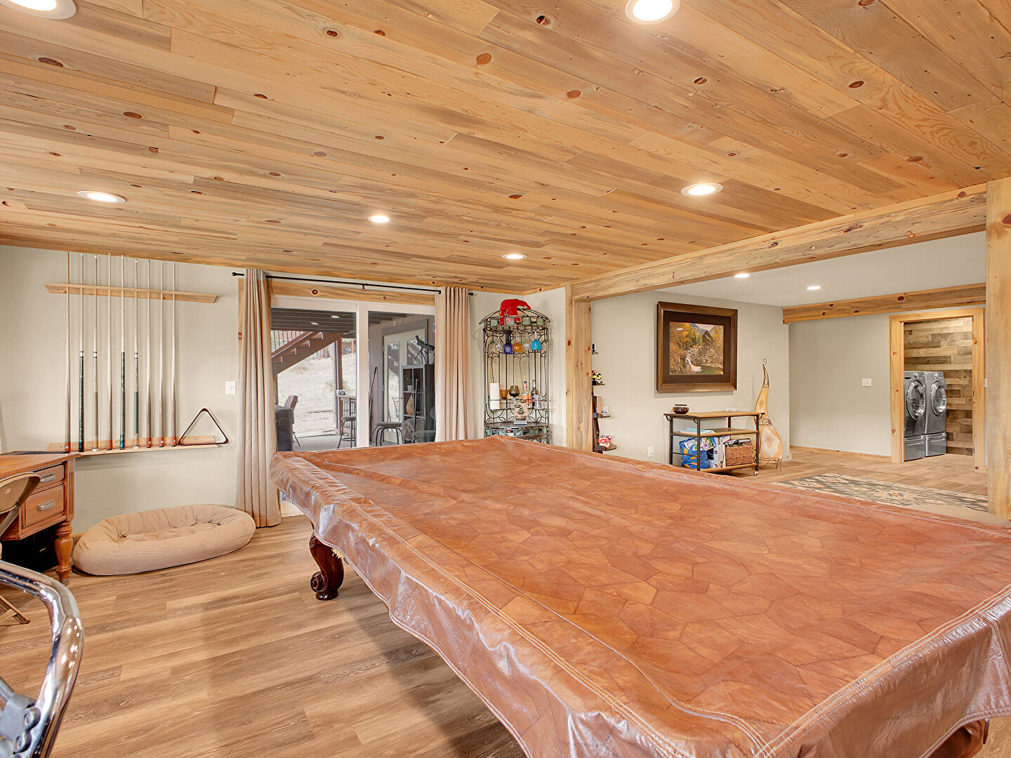 Barn Door, Baseboards Wall, Beamed Ceiling, Billiards, Drywall, Laundry, Natural Light, Recessed Lighting, Wood Ceiling, Wood Finish Floor, Drywall, Wood Finish Floor