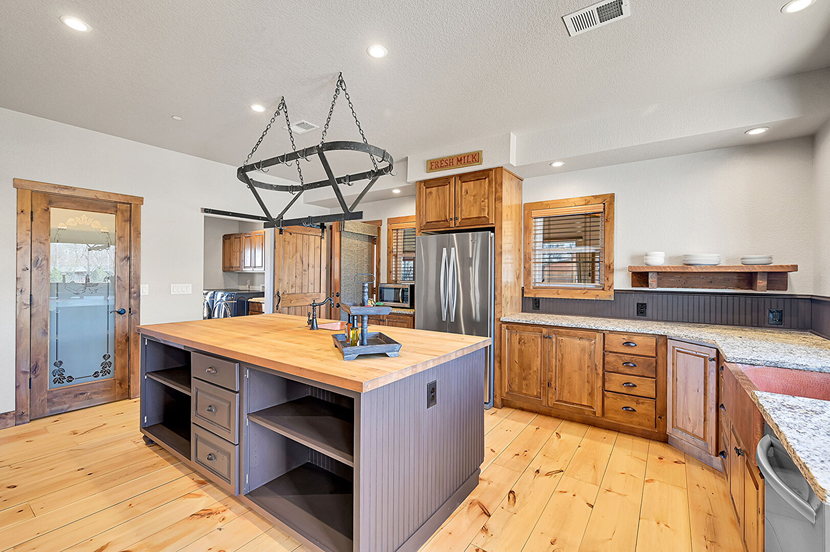 Beamed Ceiling, Butcher Block Countertops, Ceiling Fan, Drywall, Fireplace, Gray Cabinets, High Ceiling, Kitchen Bar, Kitchen Island, Kitchen Peninsula, Medium Brown Cabinets, Multiple Kitchen Islands, Natural Light, Open Shelves, Opens To Living Area, Pass Through Window, Pendant Lighting, Raised Cabinets, Recessed Lighting, Shaker Cabinets, Stone Countertops, Stone Wall, Textured Ceiling, Tile Floor, Toaster, U Shaped Kitchen, Vaulted Ceiling, Vent, Wine Cooler, Wood Ceiling, Wood Finish Floor, Beamed Ceiling, Butcher Block Countertops, Ceiling Fan, Drywall, Kitchen Island, Stone Countertops