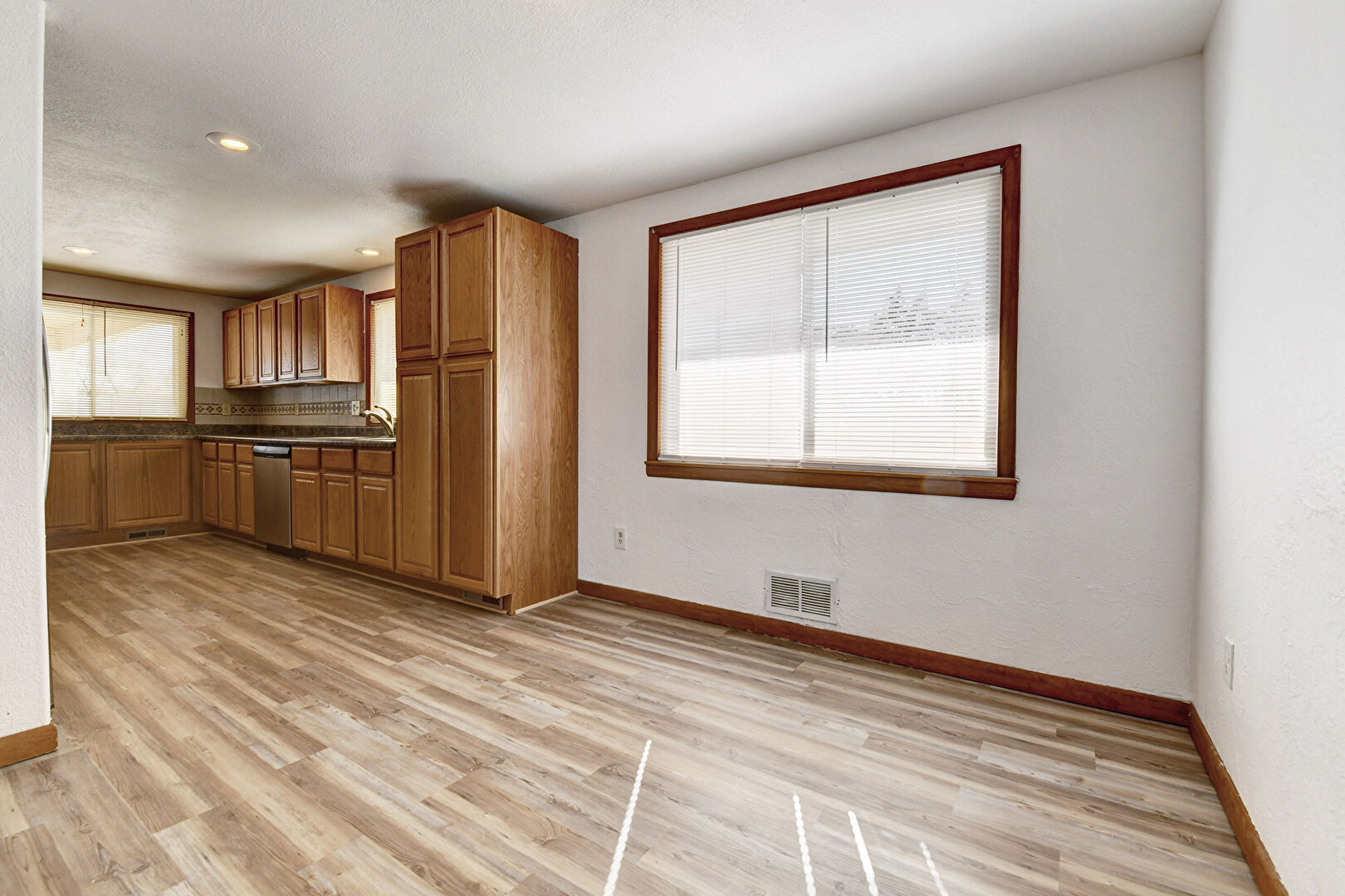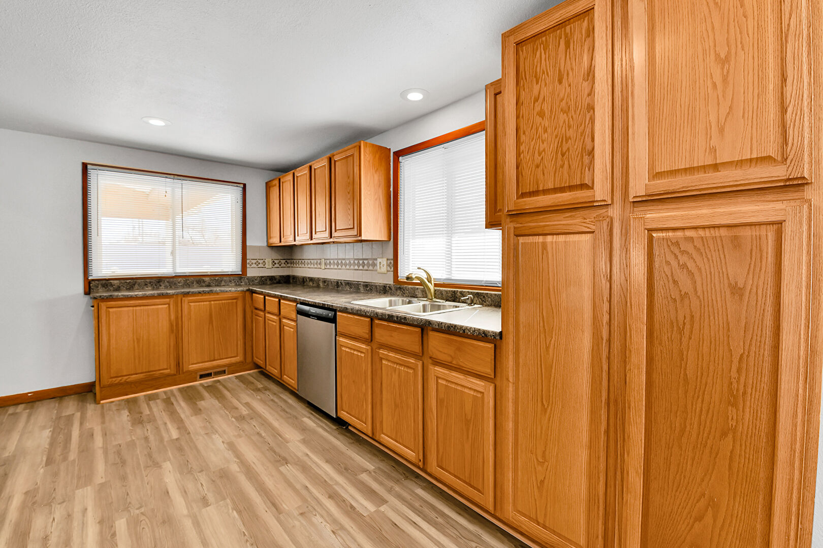 Baseboards Wall, Drywall, Medium Brown Cabinets, Natural Light, Raised Cabinets, Recessed Lighting, Textured Ceiling, Vent, Wood Finish Floor, Baseboards Wall, Drywall, Medium Brown Cabinets, Raised Cabinets, Recessed Lighting