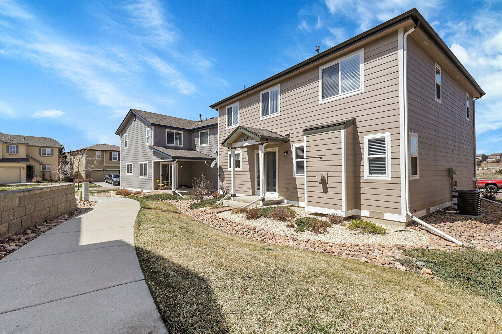 Central Ac, Concrete Foundation, Downspout, Gutters, Horizontal Siding, Lawn, Residential View, Satellite Dish, Stoop, Gutters, Horizontal Siding