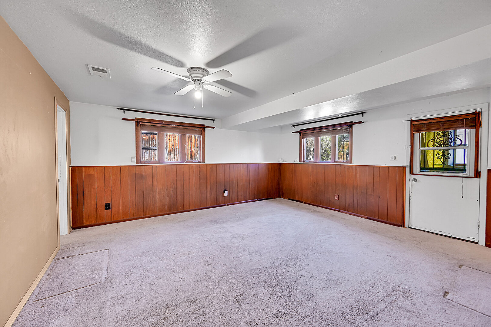 Baseboards Wall, Carpet, Ceiling Fan, Drywall, Natural Light, Textured Ceiling, Vent, Wainscot Wall, Wood Wall, Ceiling Fan, Vent