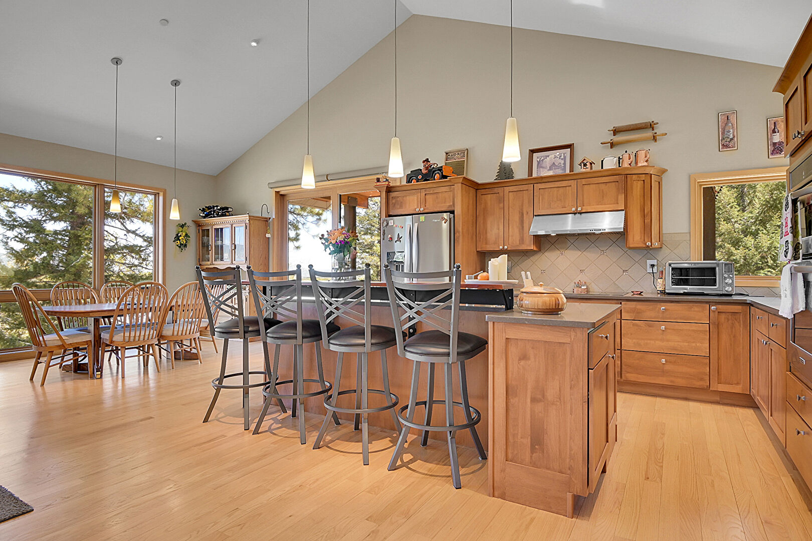 Ceiling Fan, Double Oven, Drywall, High Ceiling, L Shaped Kitchen, Mountain View, Natural Light, Recessed Lighting, Vaulted Ceiling, Vent, Wood Finish Floor, Wood Stove, Cathedral Ceiling, Drywall, Mountain View, Wood Finish Floor