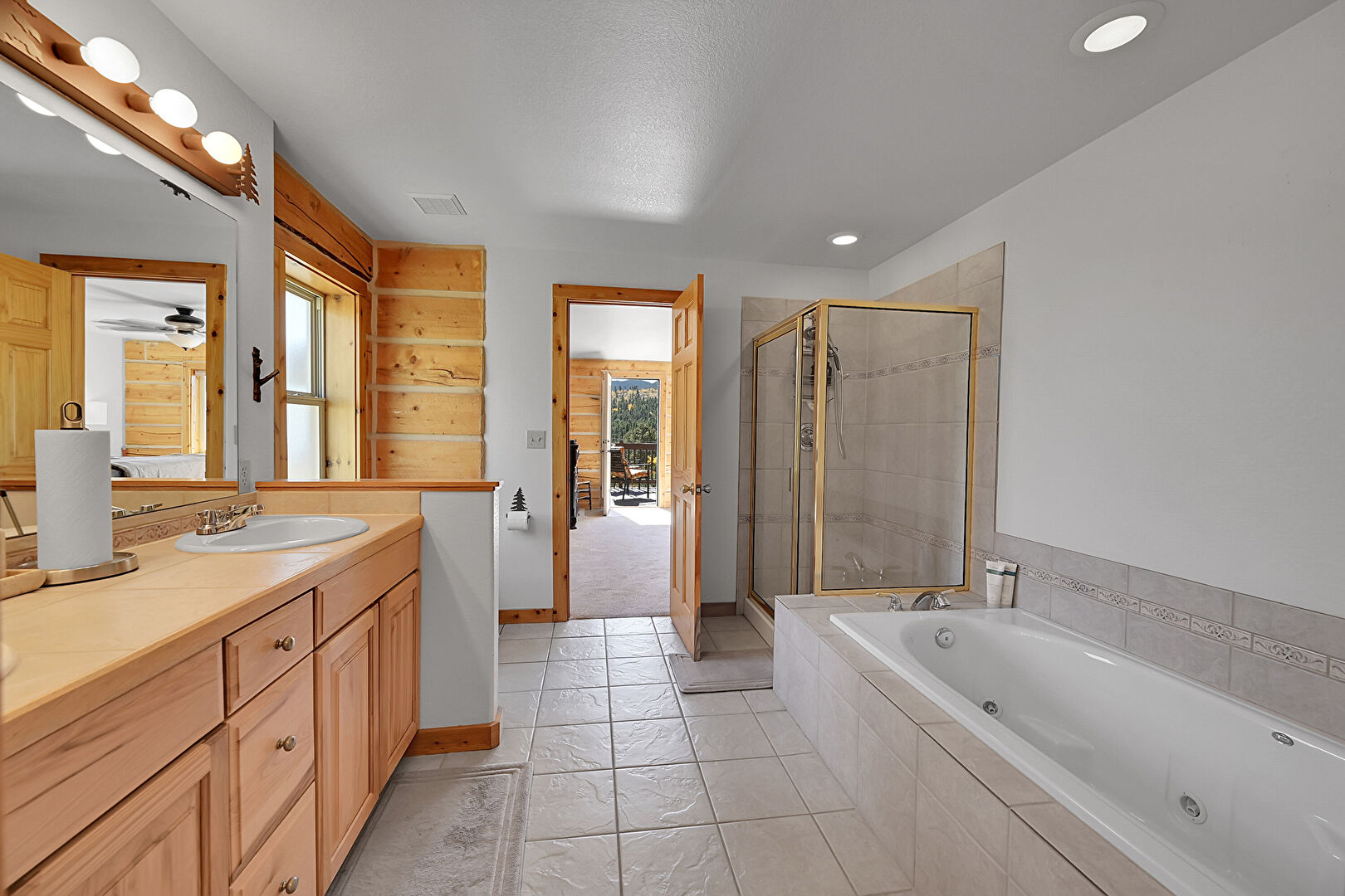 Baseboards Wall, Double Vanity, Drywall, Ensuite Bathroom, Natural Light, Recessed Lighting, Tile Floor, Vent, Full Bathroom