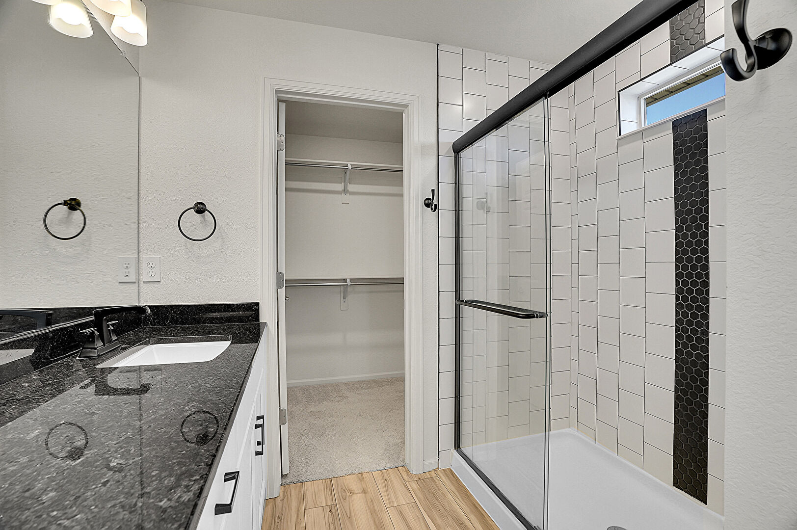 Baseboards Wall, Drywall, Full Bathroom, Natural Light, Recessed Lighting, Vanity, Walk In Closet, Wood Finish Floor, Double Vanity, Walk In Closet