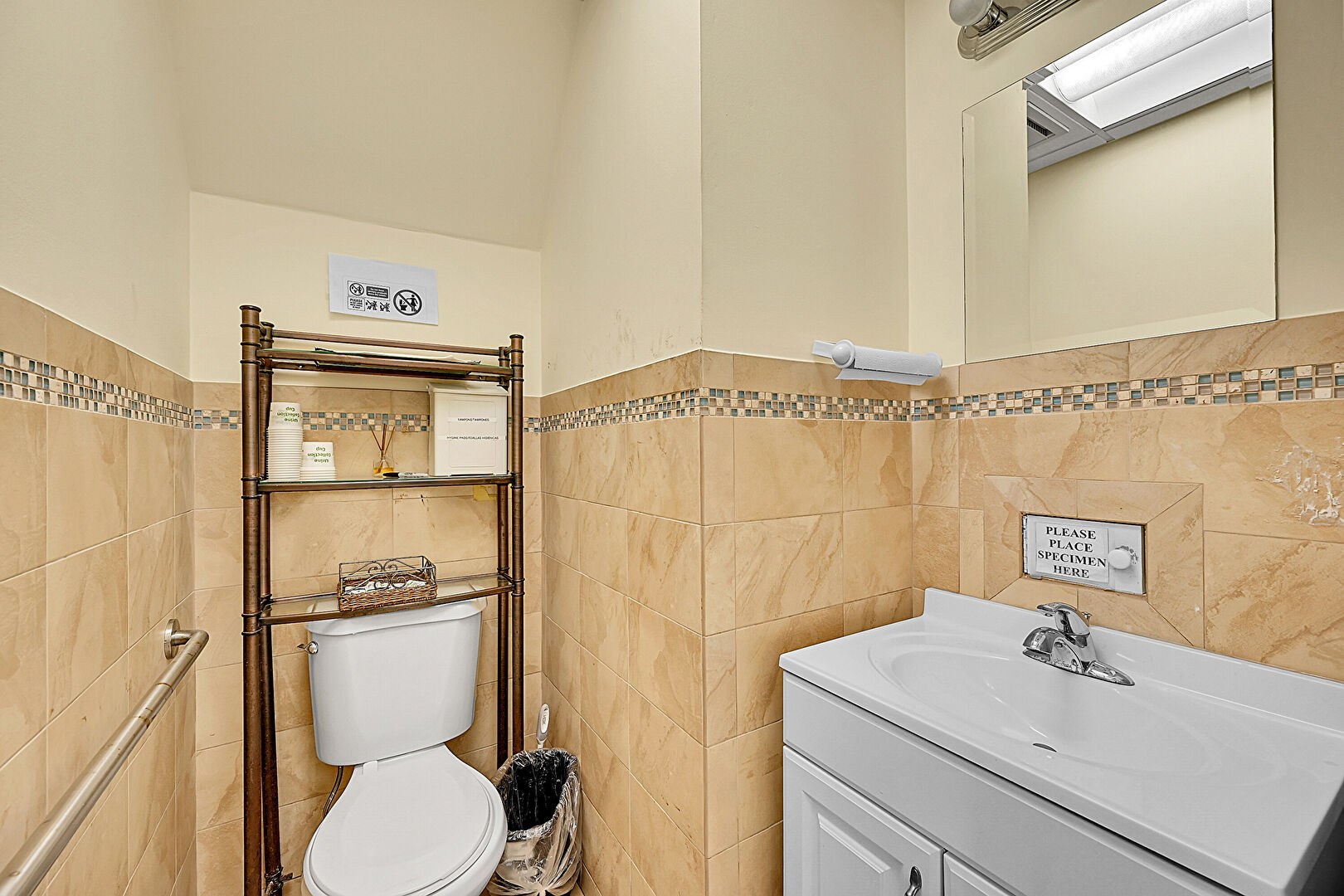 Drywall, Half Bathroom, Tile Floor, Tile Wall, Vanity, Vent, Wainscot Wall, Tile Wall, Vanity