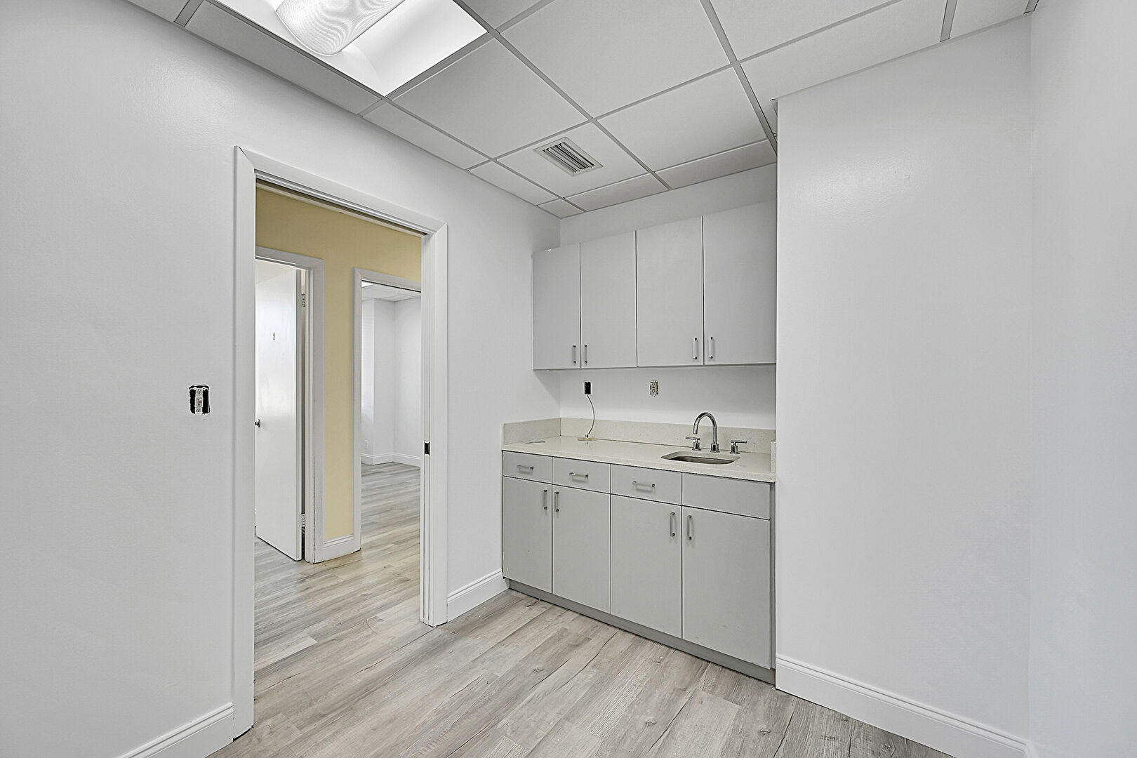 Baseboards Wall, Drop Ceiling, Drywall, Fire Extinguisher, Laundry, Pass Through Window, Vanity, Vent, Wood Finish Floor, Baseboards Wall, Drop Ceiling, Fire Extinguisher, Wood Finish Floor