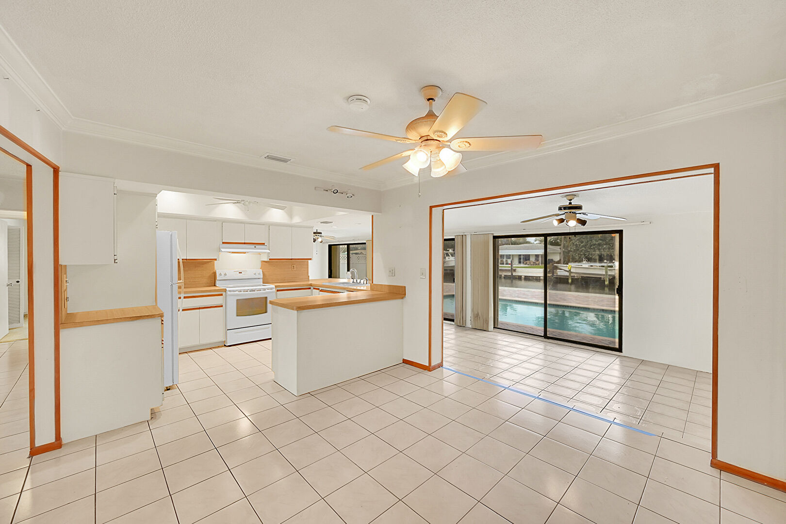 Baseboards Wall, Ceiling Fan, Crown Molding, Drywall, Kitchen Peninsula, Natural Light, Opens To Living Area, Pass Through Window, Smoke Carbon Monoxide Detector, Tile Floor, Vent, Baseboards Wall, Drywall