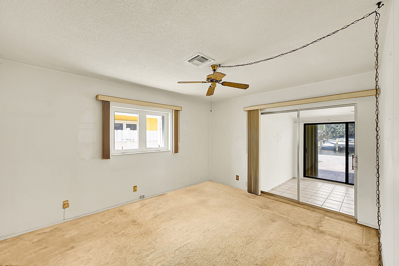 Carpet, Ceiling Fan, Drywall, Natural Light, Two Closets, Vent, Textured Ceiling
