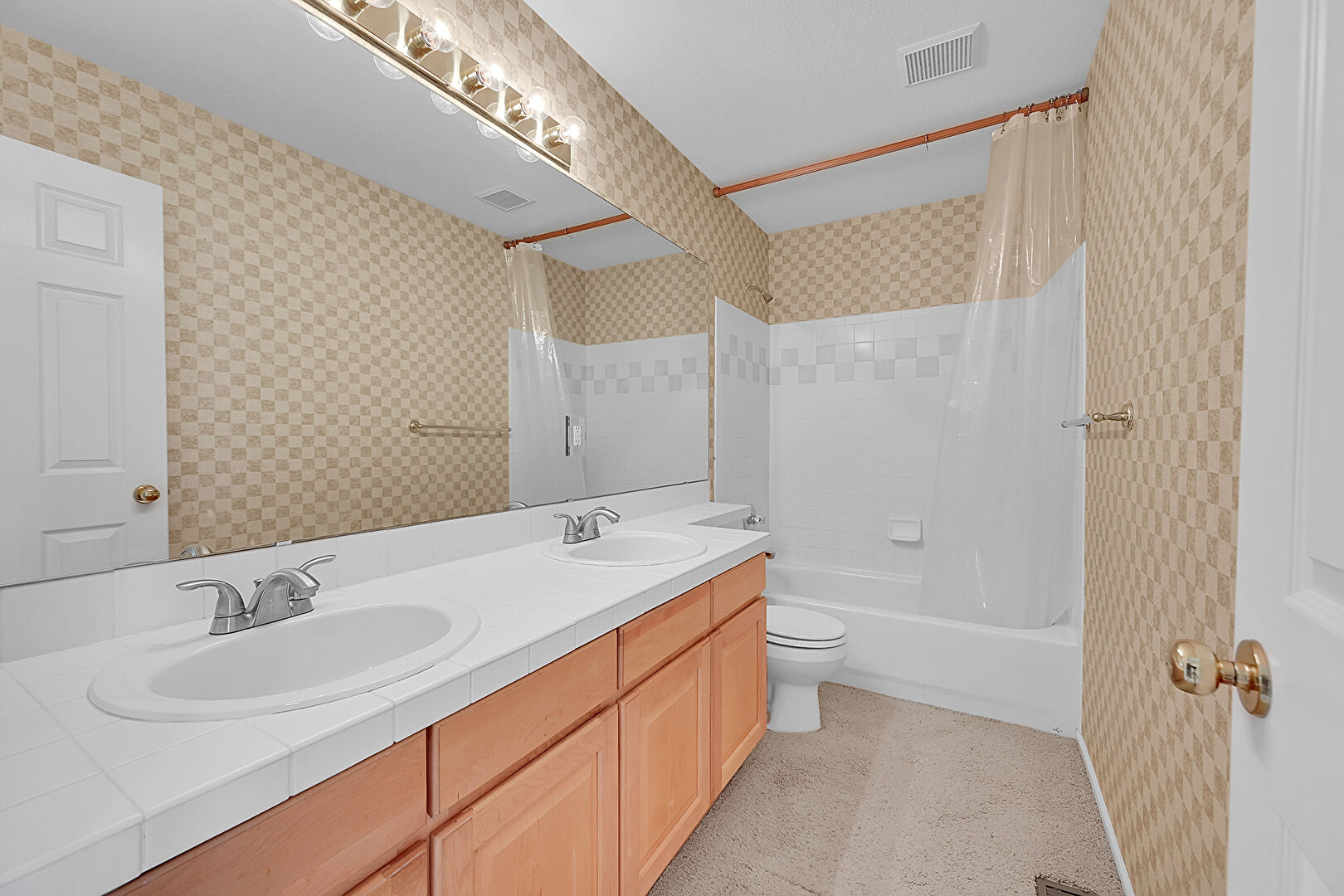 Baseboards Wall, Combined Bath Shower, Double Vanity, Full Bathroom, Half Bathroom, Natural Light, Vent, Wallpaper Wall, Wood Finish Floor, Vanity, Wallpaper Wall