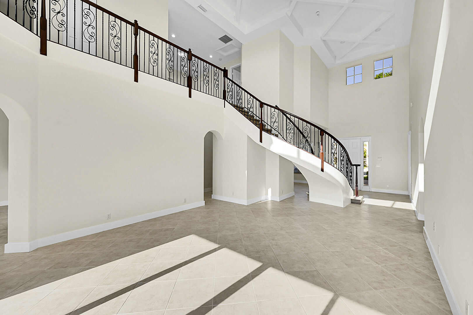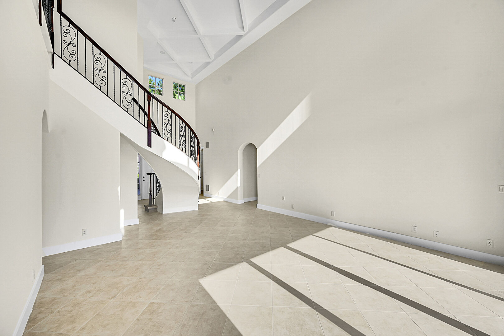 Baseboards Wall, Beamed Ceiling, Coffered Ceiling, Drywall, High Ceiling, Natural Light, Recessed Lighting, Stairs, Tile Floor, Vent, Baseboards Wall, High Ceiling