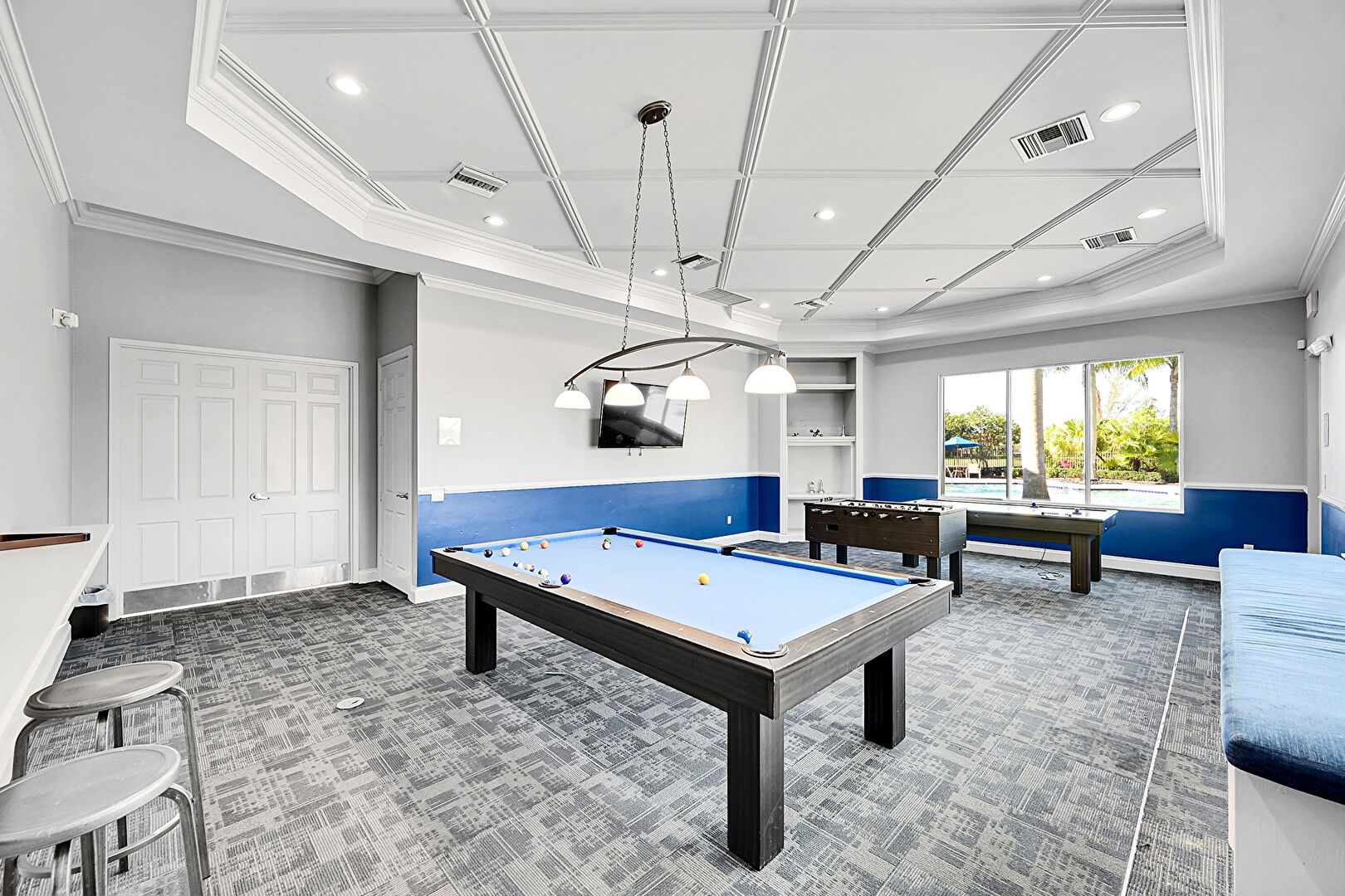 Baseboards Wall, Billiards, Carpet, Coffered Ceiling, Crown Molding, Natural Light, Recessed Lighting, Vent, Drywall