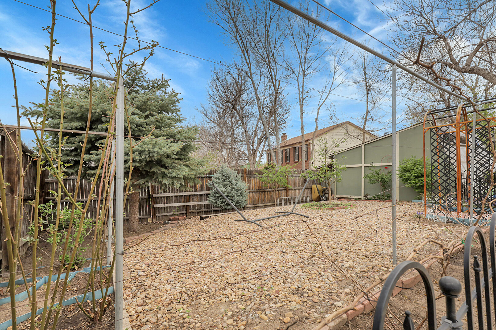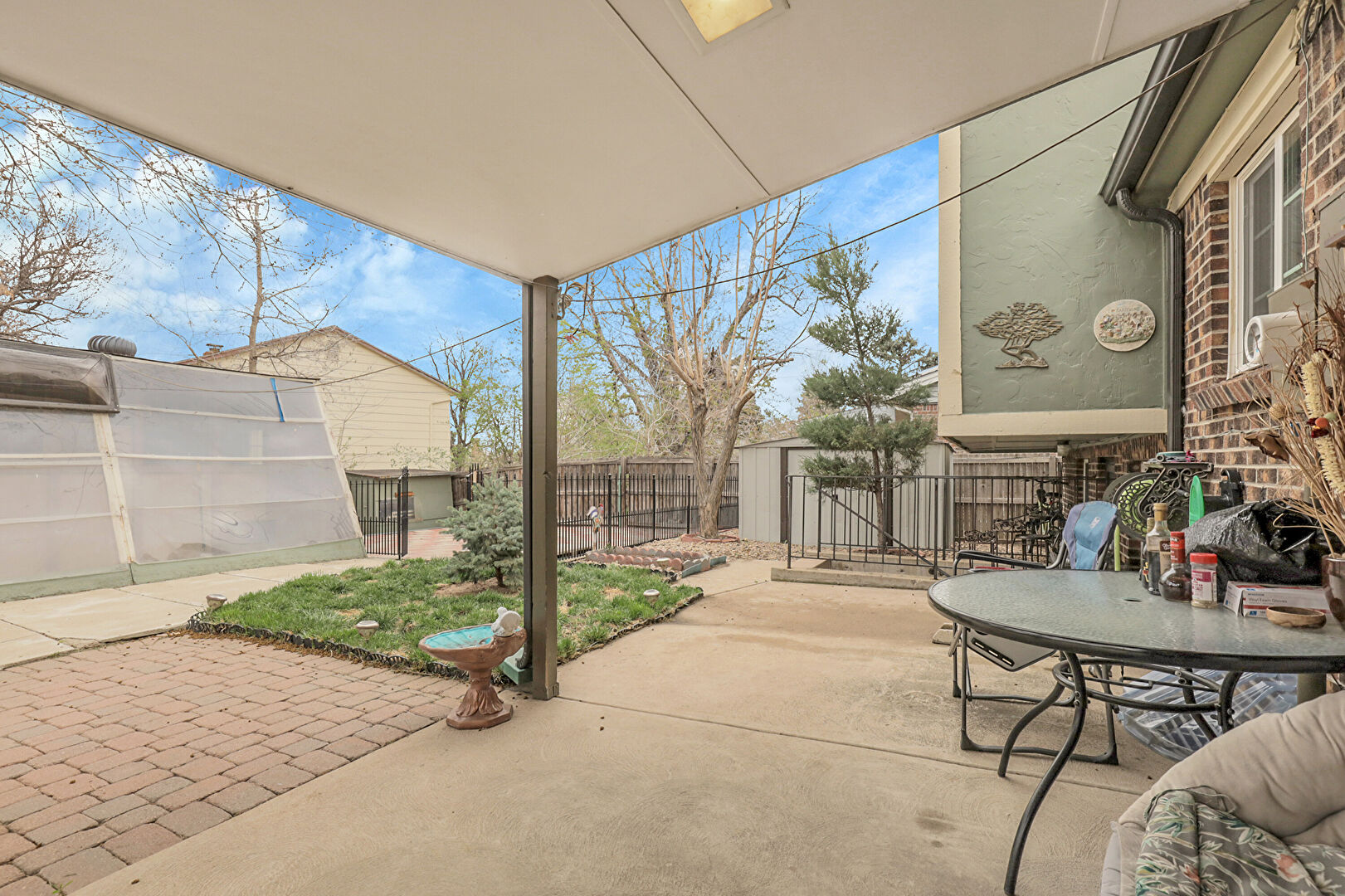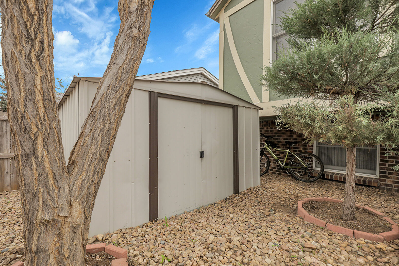 Brick Siding, Downspout, Fence, Gutters, Outdoor Structure, Patio, Shingle Roof, Fence, Shed