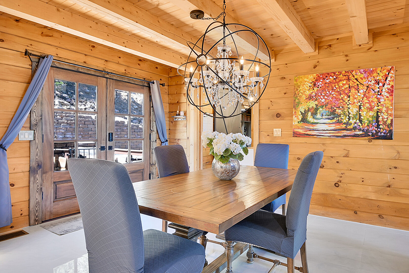 Beamed Ceiling, French Doors, L Shaped Kitchen, Natural Light, Notable Chandelier, Recessed Lighting, Stairs, Tile Floor, Vent, Wood Ceiling, Wood Wall, Notable Chandelier, Recessed Lighting, Stairs, Tile Floor, Vent, Wood Finish Floor