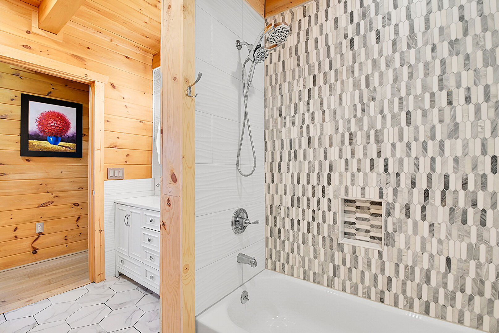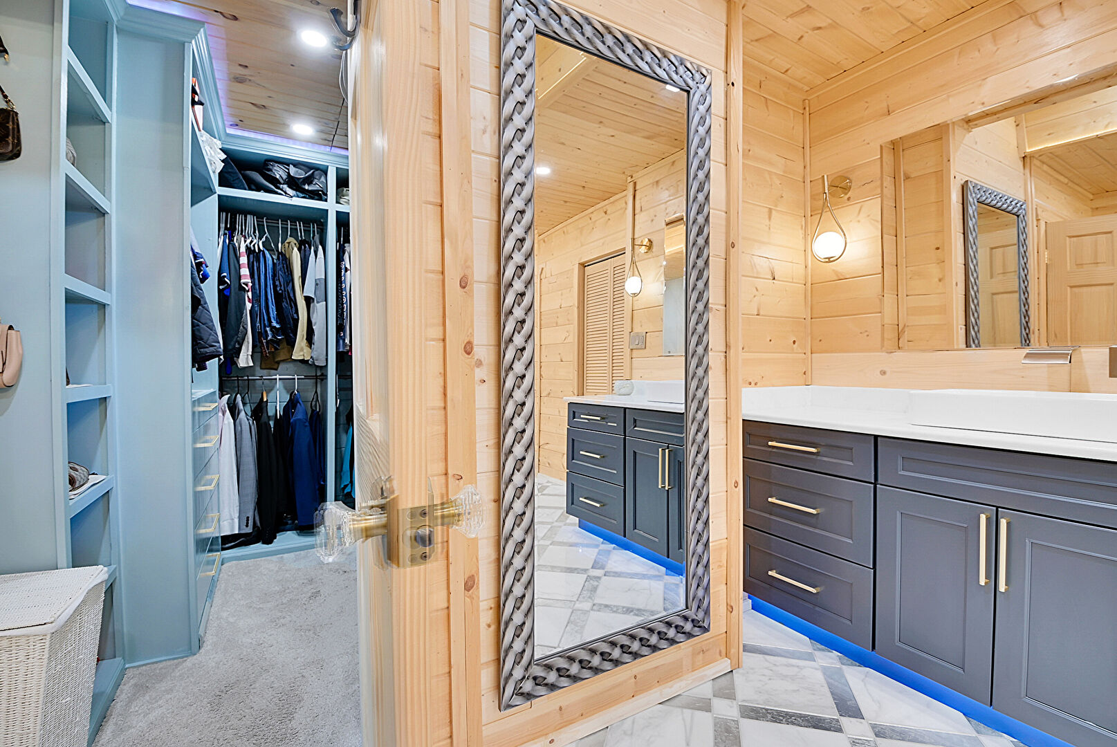 Beamed Ceiling, Ceiling Fan, Closet, Double Vanity, Full Bathroom, Natural Light, Notable Chandelier, Recessed Lighting, Tile Floor, Tile Wall, Vanity, Vent, Vinyl Floor, Walk In Closet, Wood Ceiling, Wood Wall, Combined Bath Shower, Double Vanity, Full Bathroom, Natural Light, Recessed Lighting, Tile Wall, Vanity, Wood Wall