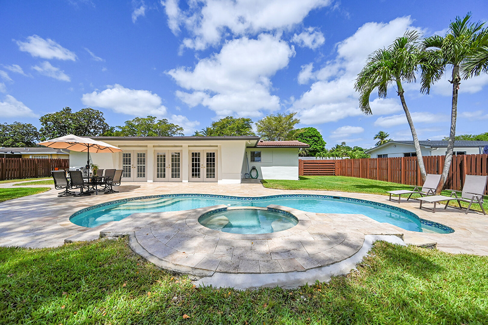 Fence, French Doors, Hot Tub, Lawn, Patio, Pool, Pool Hot Tub Combo, Patio, Pool