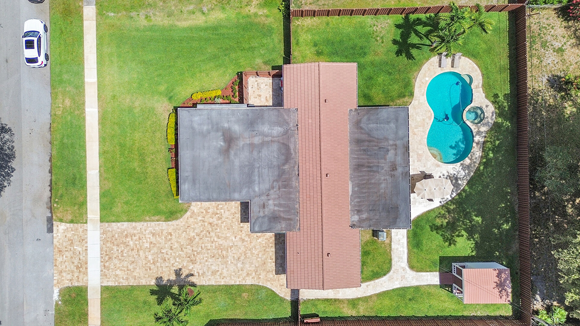 Fence, French Doors, Lawn, Patio, Pool, Shed, Split Ac Unit, Outdoor Structure, Pool, Pool Hot Tub Combo