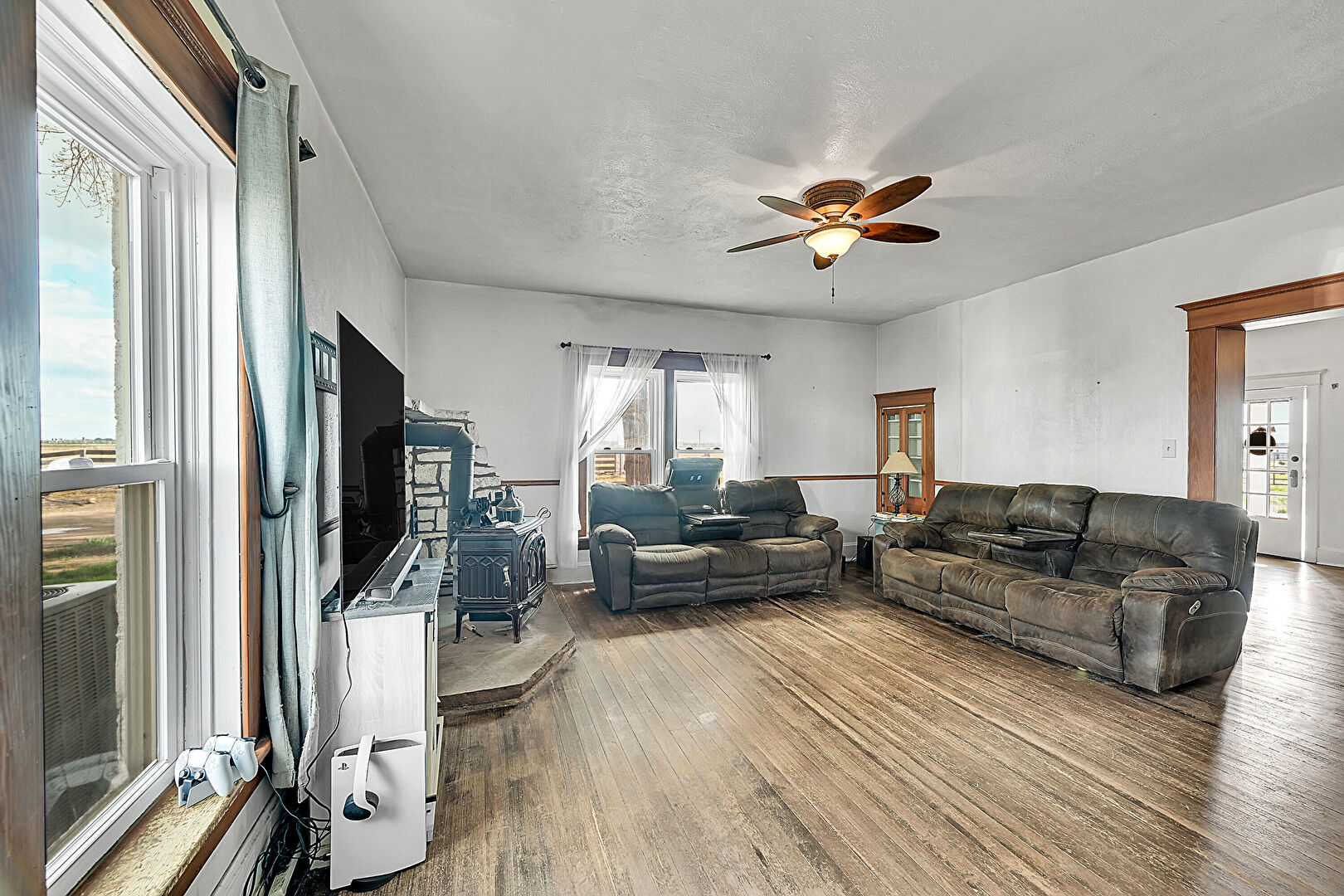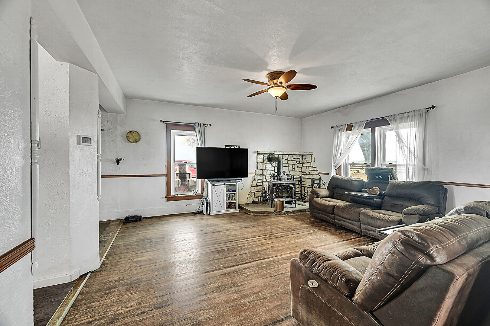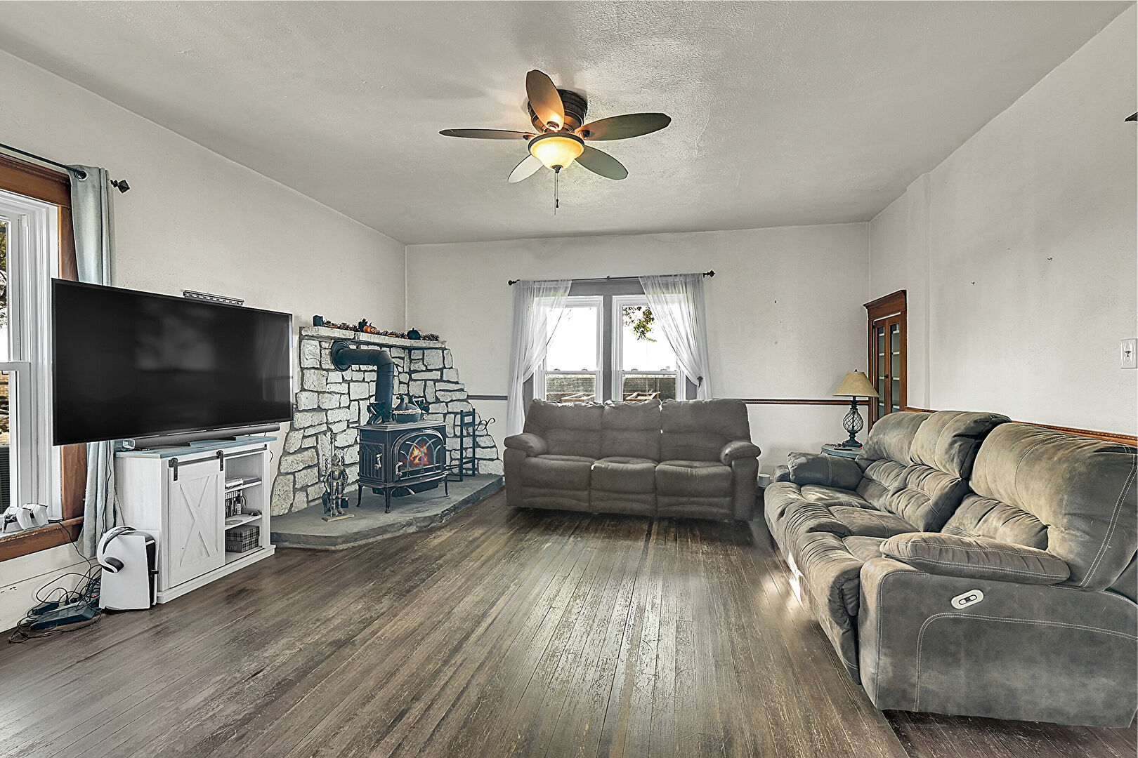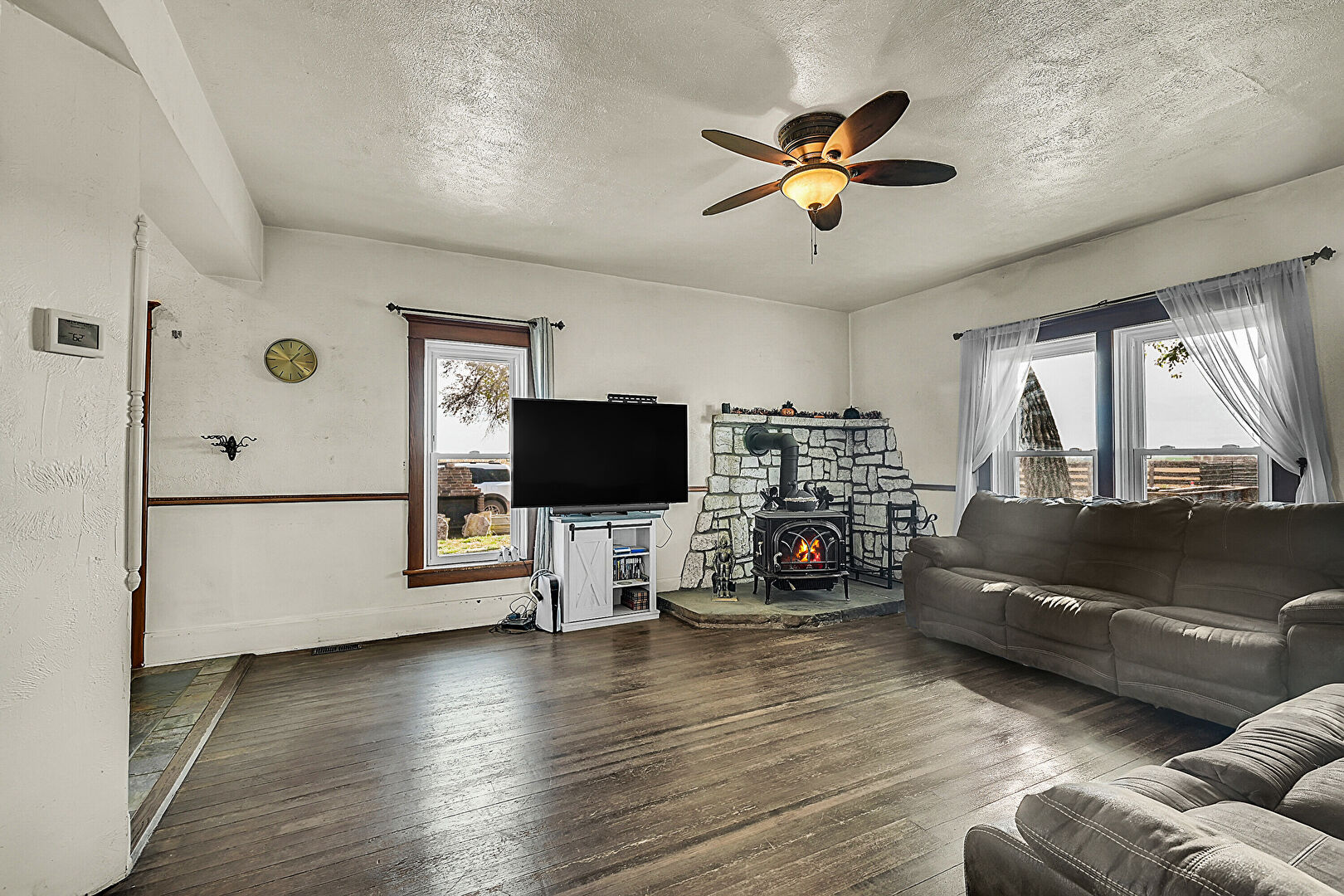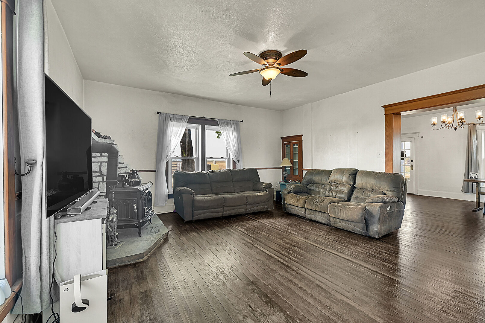 Baseboards Wall, Ceiling Fan, Drywall, Natural Light, Notable Chandelier, Textured Ceiling, Wood Finish Floor, Wood Stove, Drywall, Natural Light, Wood Finish Floor