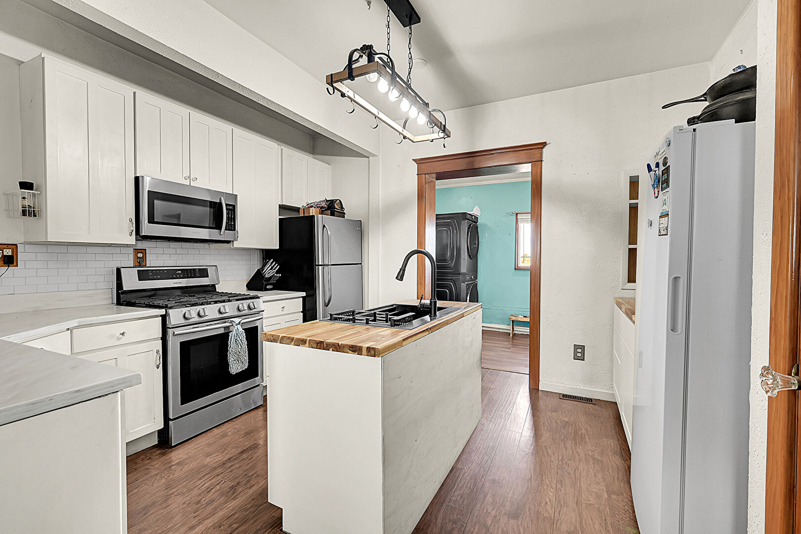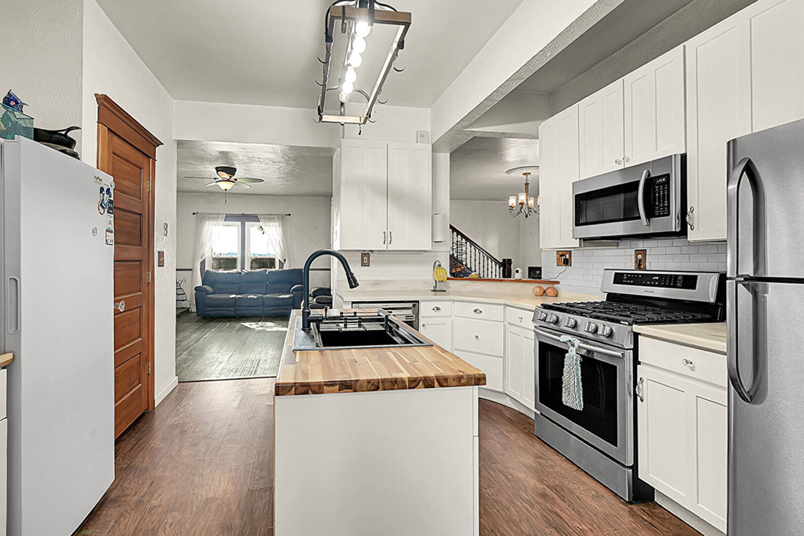 Baseboards Wall, Butcher Block Countertops, Ceiling Fan, Drywall, Kitchen Island, L Shaped Kitchen, Laundry, Natural Light, Open Shelves, Opens To Living Area, Pass Through Window, Pendant Lighting, Shaker Cabinets, Wood Finish Floor, Notable Chandelier, Vent