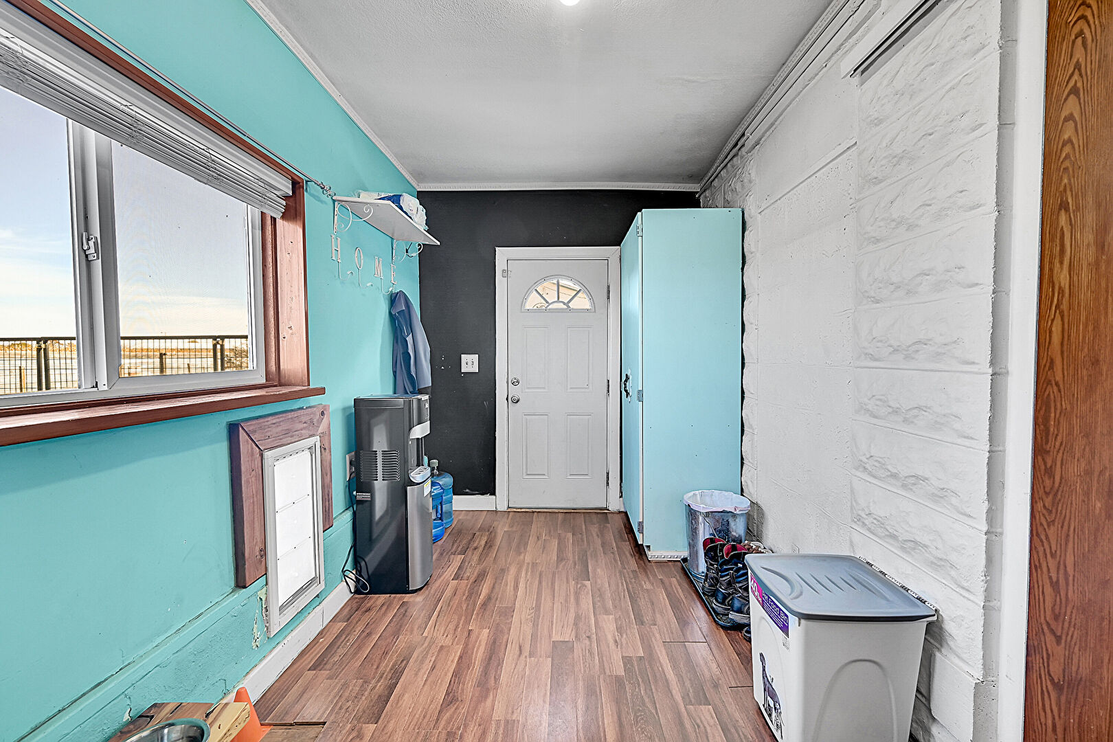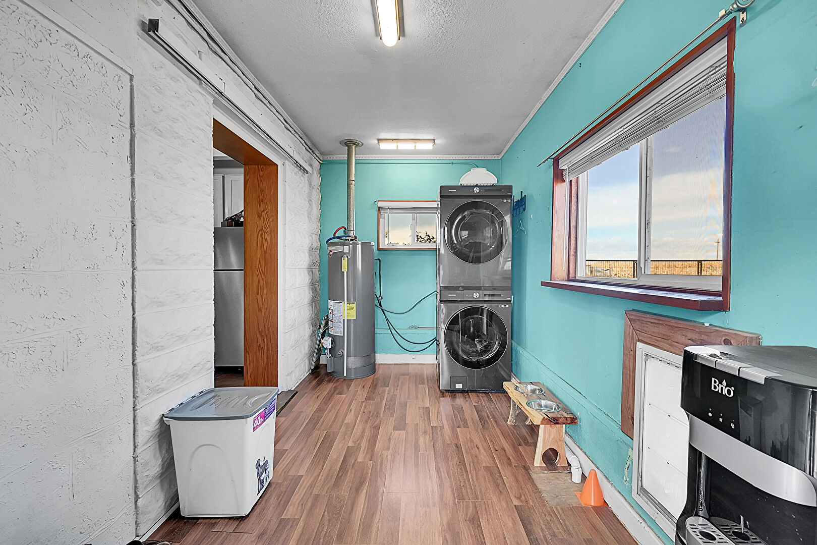 Baseboards Wall, Crown Molding, Drywall, Laundry, Natural Light, Textured Ceiling, Water Heater, Wood Finish Floor, Concrete Block Wall