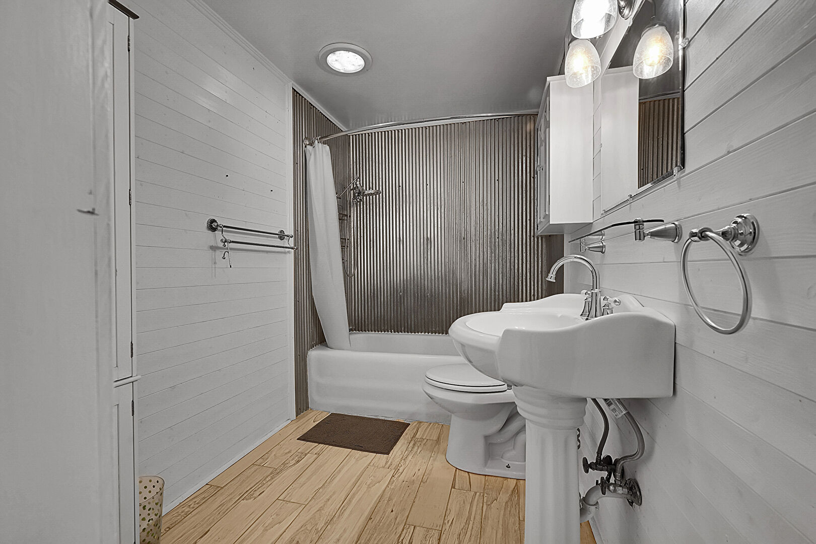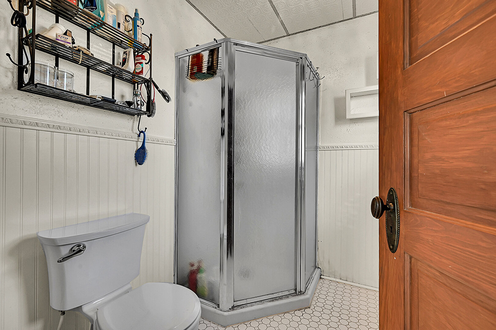 Combined Bath Shower, Drywall, Full Bathroom, Half Bathroom, Natural Light, Tile Floor, Wainscot Wall, Wood Finish Floor, Wood Wall, Crown Molding, Full Bathroom, Half Bathroom, Tile Floor