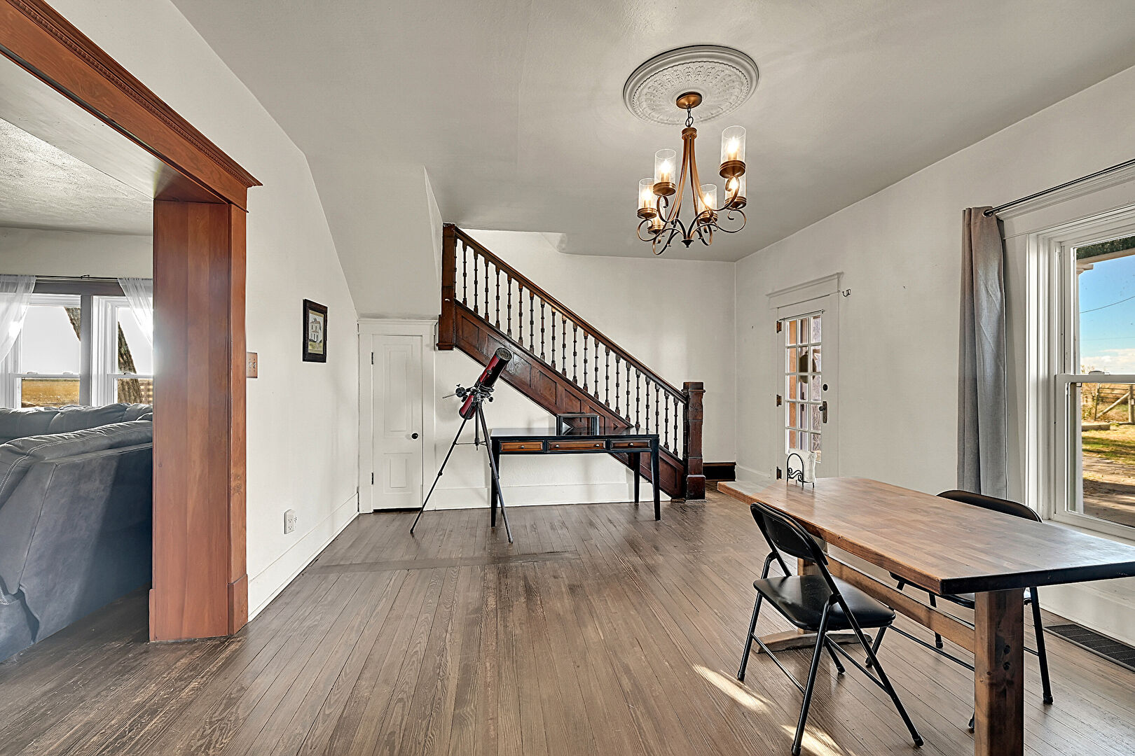 Baseboards Wall, Drywall, Natural Light, Notable Chandelier, Stairs, Wood Finish Floor, Baseboards Wall, Vent
