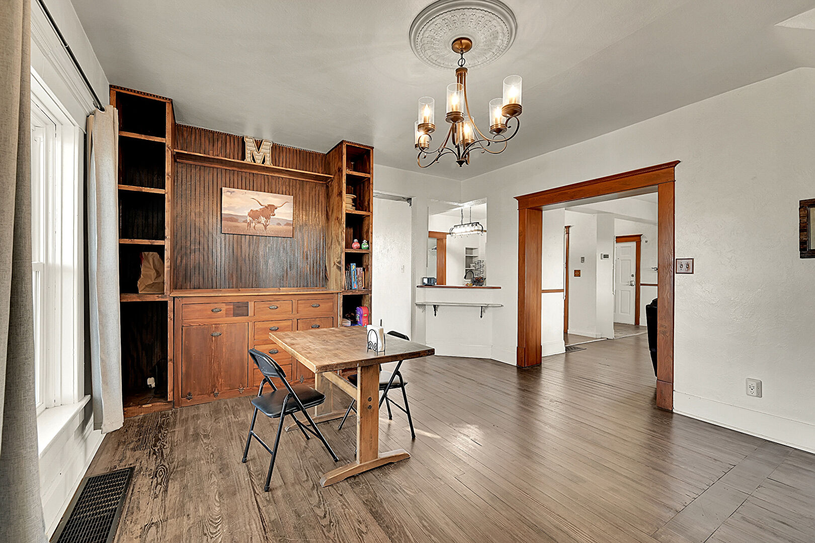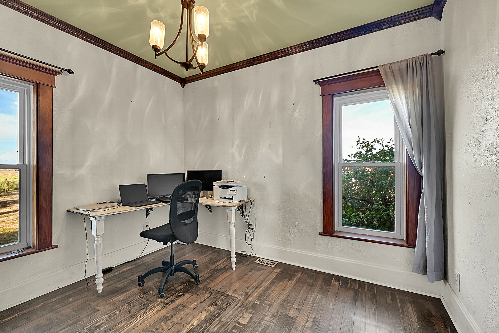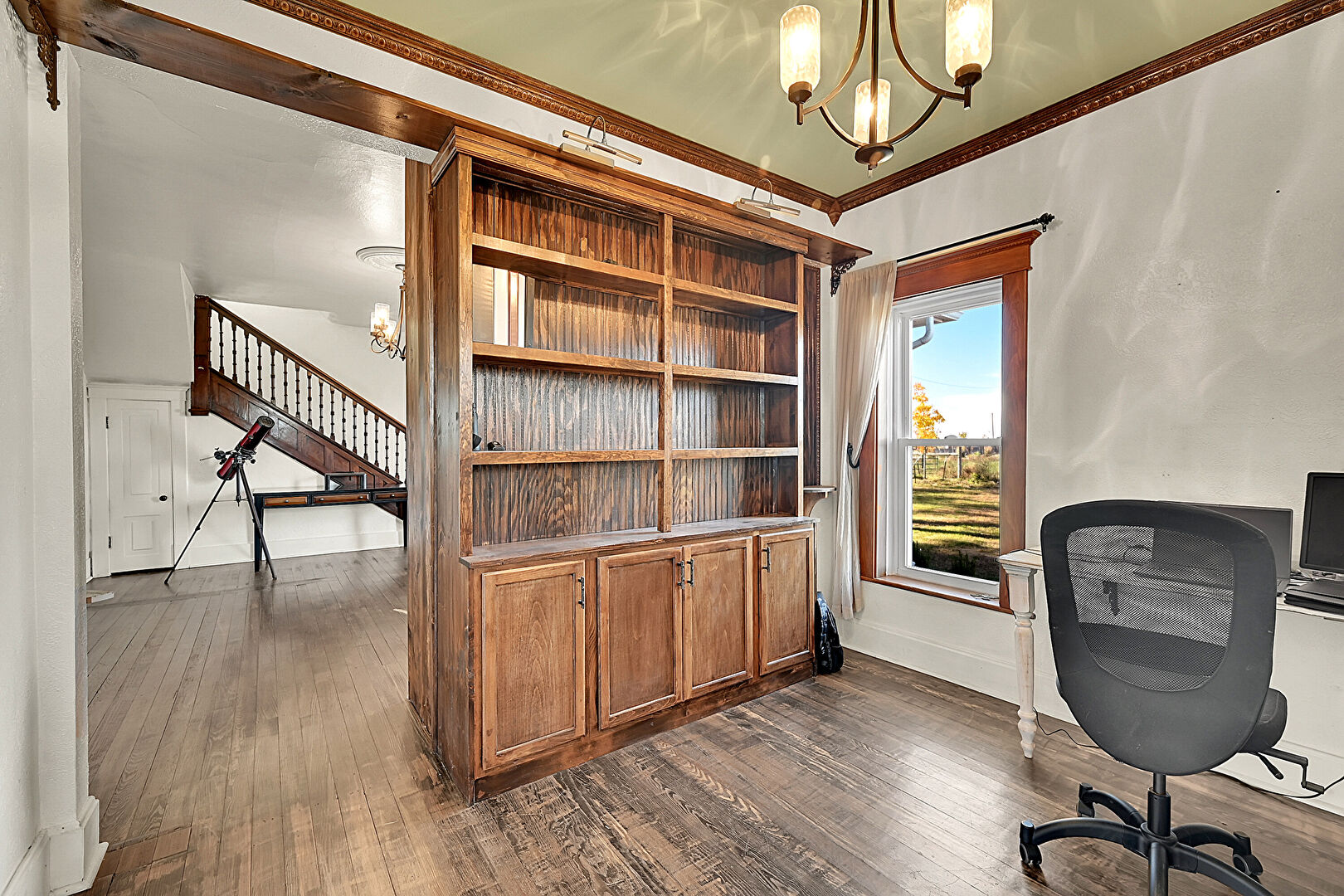 Crown Molding, Drywall, Natural Light, Notable Chandelier, Office Area, Vent, Wood Finish Floor, Baseboards Wall