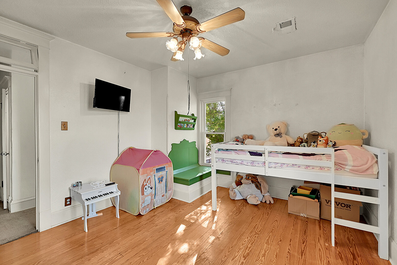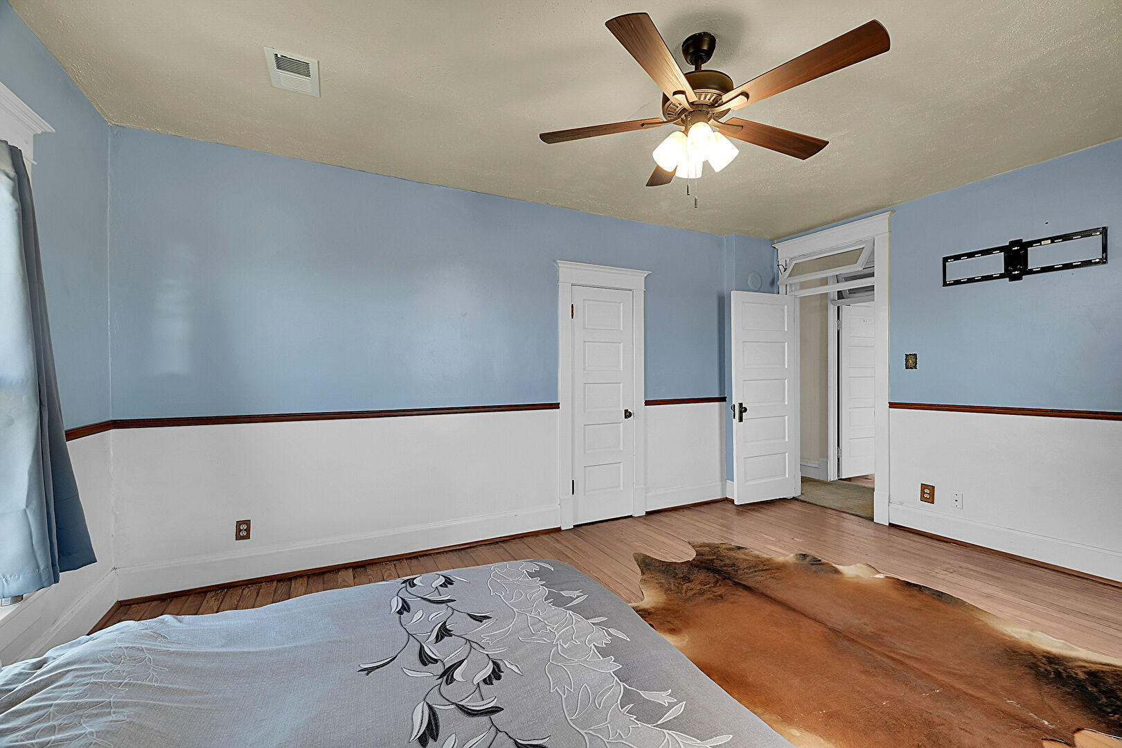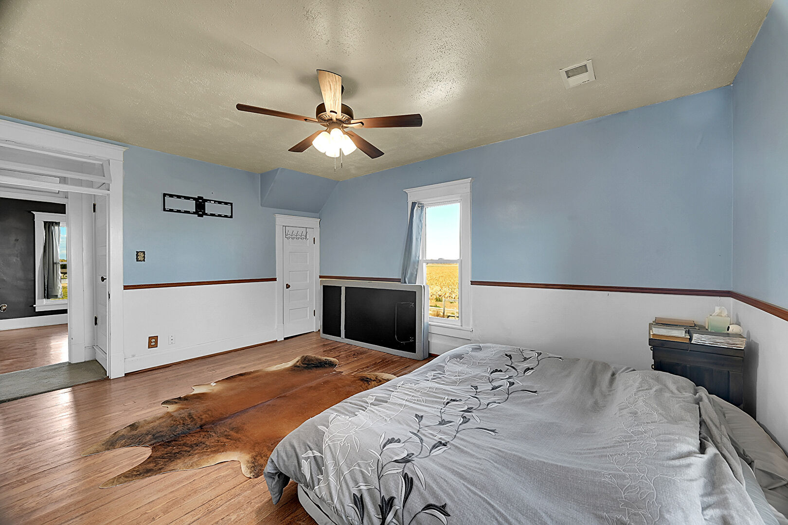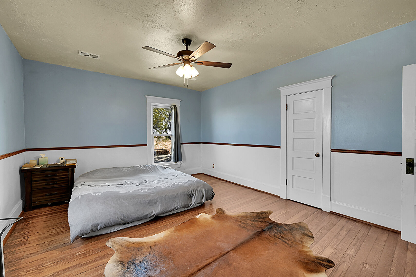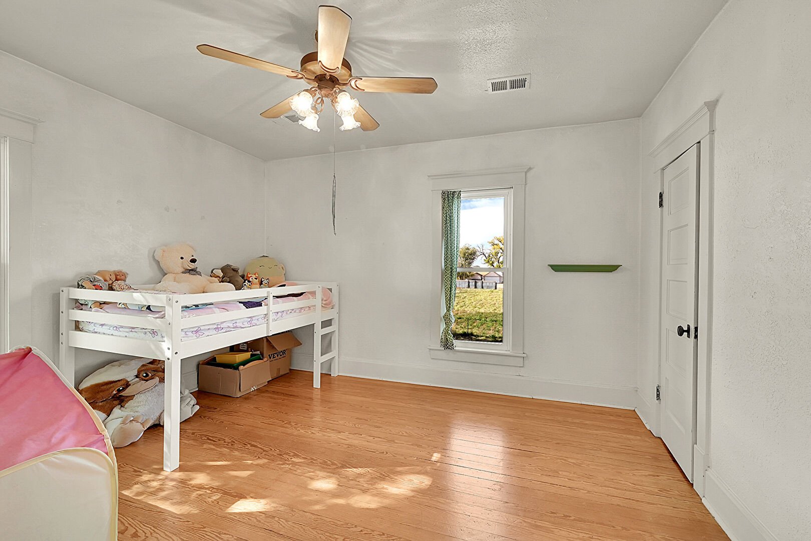 Baseboards Wall, Ceiling Fan, Drywall, Natural Light, Textured Ceiling, Vent, Wood Finish Floor, Vent, Wood Finish Floor