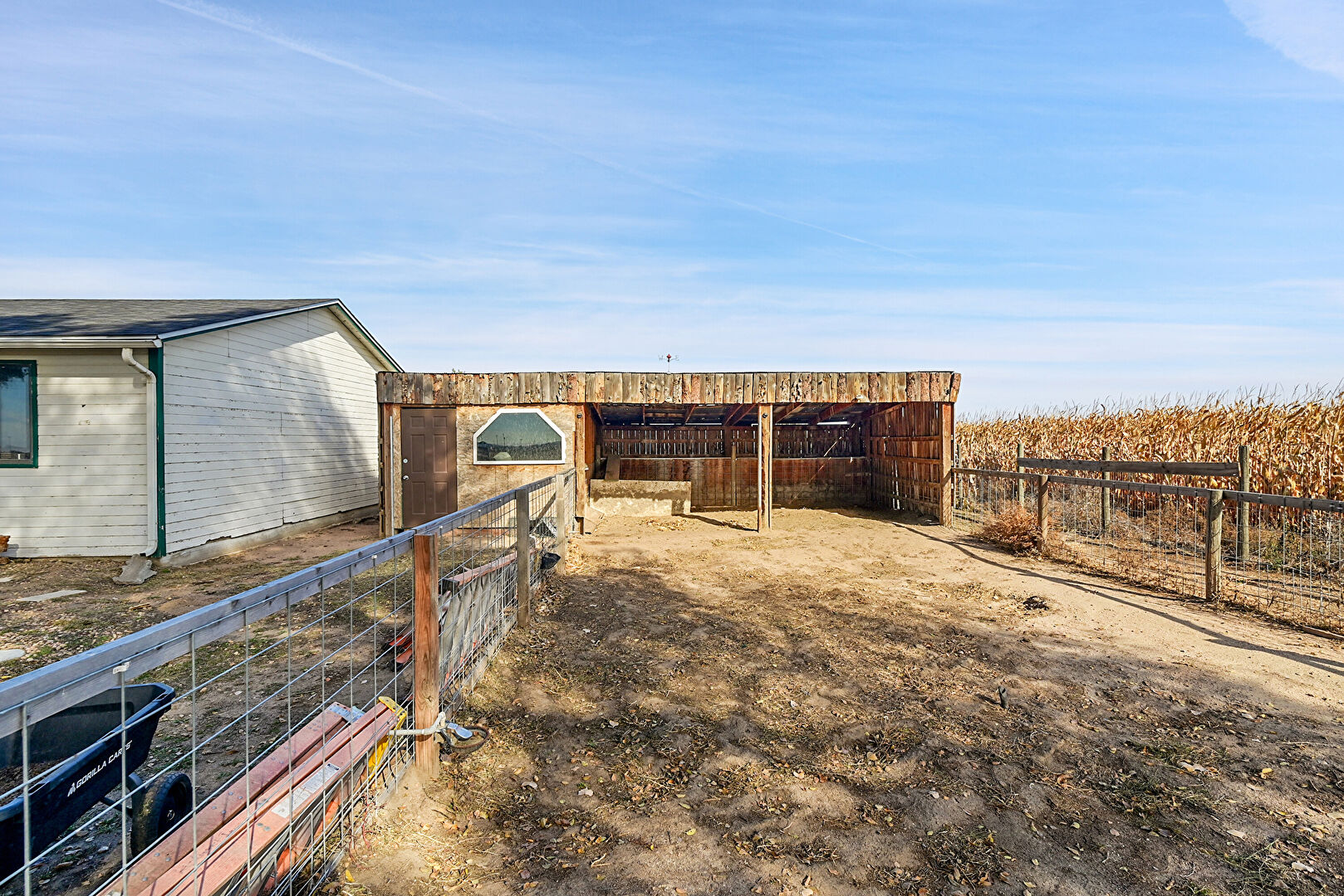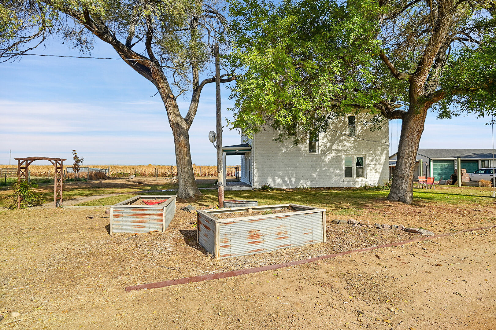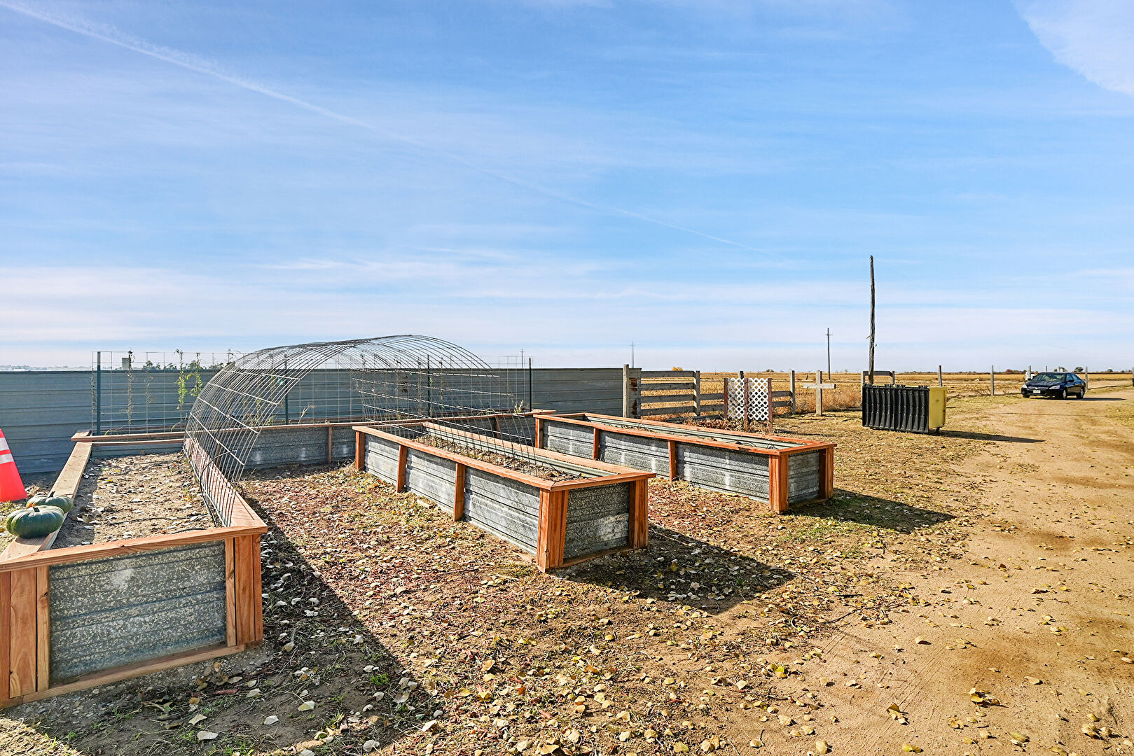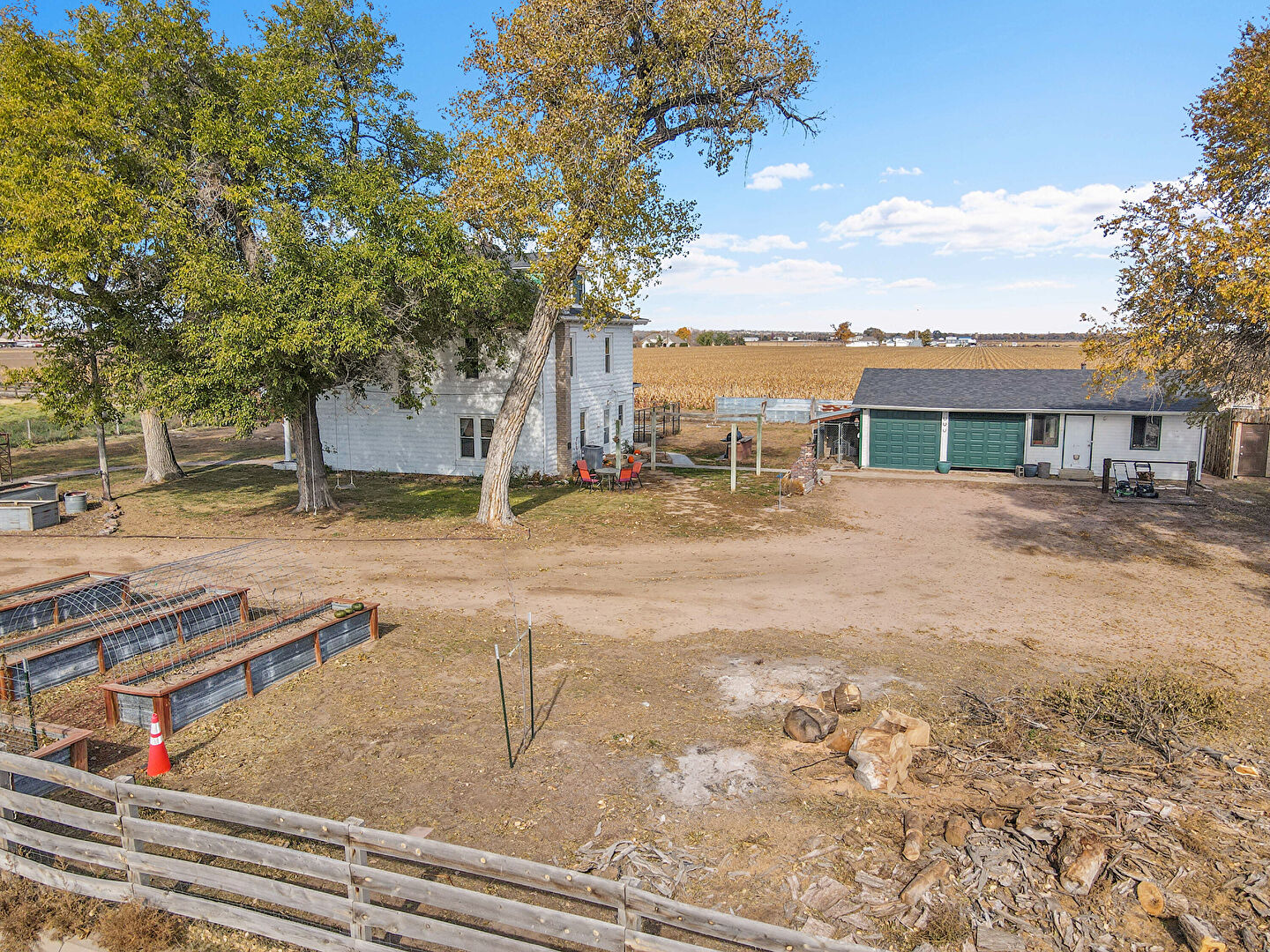 Downspout, Driveway, Fence, Garage, Garden, Gutters, Horizontal Siding, Lawn, Outdoor Structure, Parking Pad, Rural View, Stable, Concrete Foundation, Driveway, Fence, Garden, Outdoor Structure, Rural View