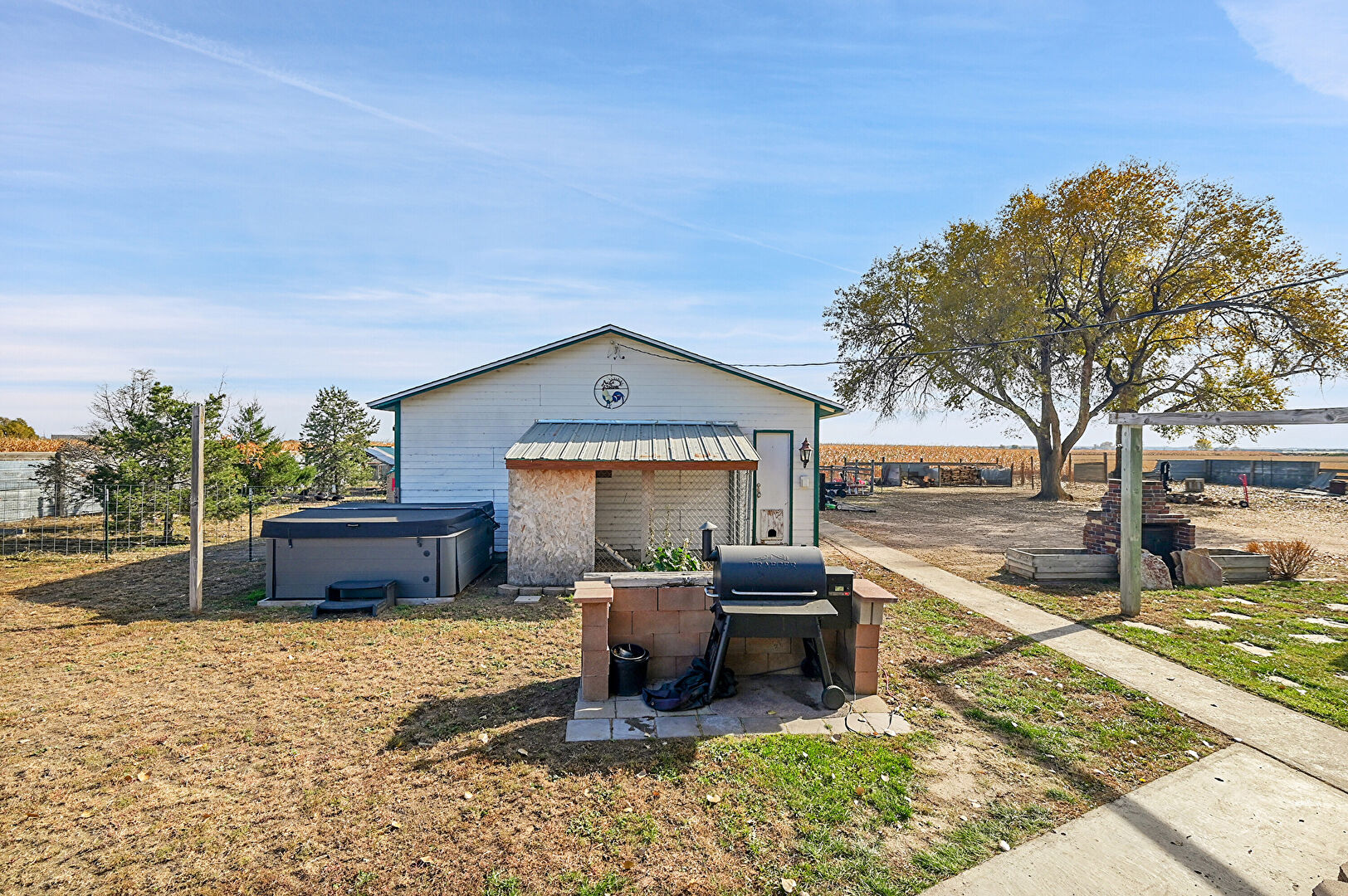 Awning, Downspout, Fence, Grill, Gutters, Hot Tub, Lawn, Outdoor Structure, Parking Pad, Horizontal Siding, Patio