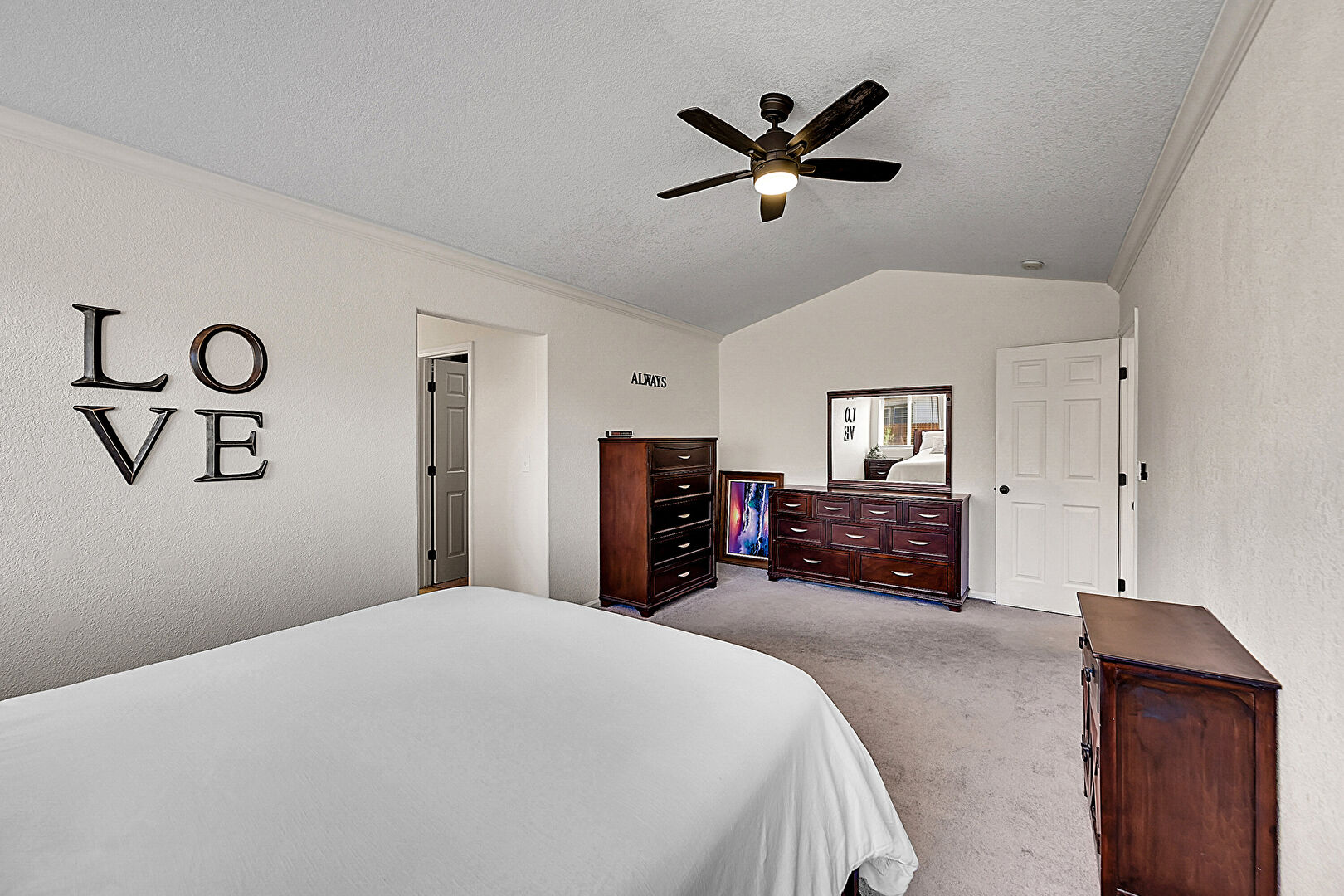 Baseboards Wall, Carpet, Cathedral Ceiling, Ceiling Fan, Crown Molding, Drywall, Natural Light, Textured Ceiling, Vaulted Ceiling, Ceiling Fan, Textured Wall