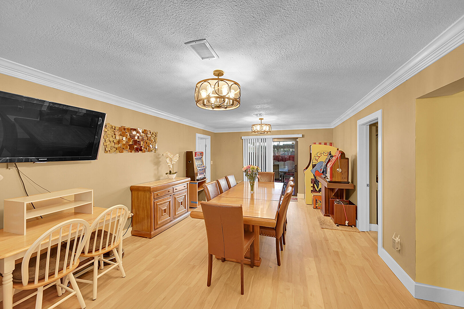 Baseboards Wall, Crown Molding, Drywall, Natural Light, Notable Chandelier, Textured Ceiling, Vent, Wood Finish Floor, Crown Molding, Drywall, Textured Ceiling
